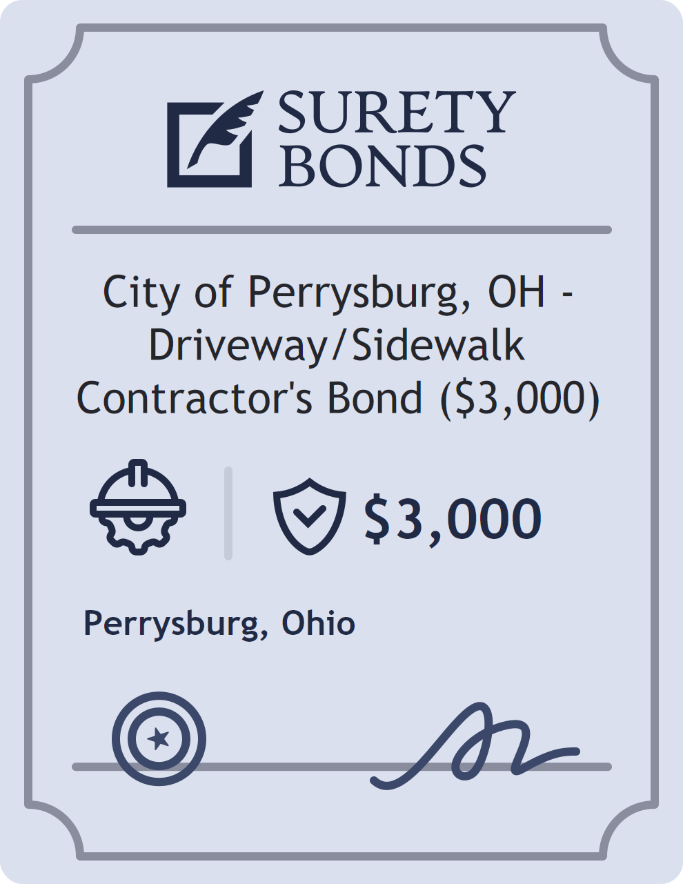 The City of Perrysburg, OH – Driveway/Sidewalk Contractor’s Bond ($3,000) is classified as a Contractor Bonds with a $3,000 obligation in Ohio. Contractor Bonds are surety bonds required for individuals or businesses performing construction work. They guarantee that contractors will comply with building codes, licensing requirements, and contractual obligations. The bond provides financial protection to property owners and the public in cases of poor workmanship, regulatory violations, or unfinished work. The surety reviews financial strength, compliance history, and indemnity support before approving the obligation. Maintaining uninterrupted coverage for the entire 1 Year term is essential; lapses can trigger penalties, contract defaults, or license suspension in Ohio. Underwriters typically request financial statements, references, and proof of licensing before quoting terms so they can evaluate repayment capacity. Throughout the bond term, the principal must maintain accurate books, respond to regulator inquiries, and remediate any complaints to prevent a claim. Many authorities in Ohio also require renewal certificates 30 to 60 days in advance, and failure to provide proof can halt permitting or bid submissions. The $3,000 limit demonstrates to customers, partners, and oversight agencies that the bonded party maintains a reliable, surety-backed source of funds dedicated to ongoing compliance. The obligee for this bond is Perrysburg.