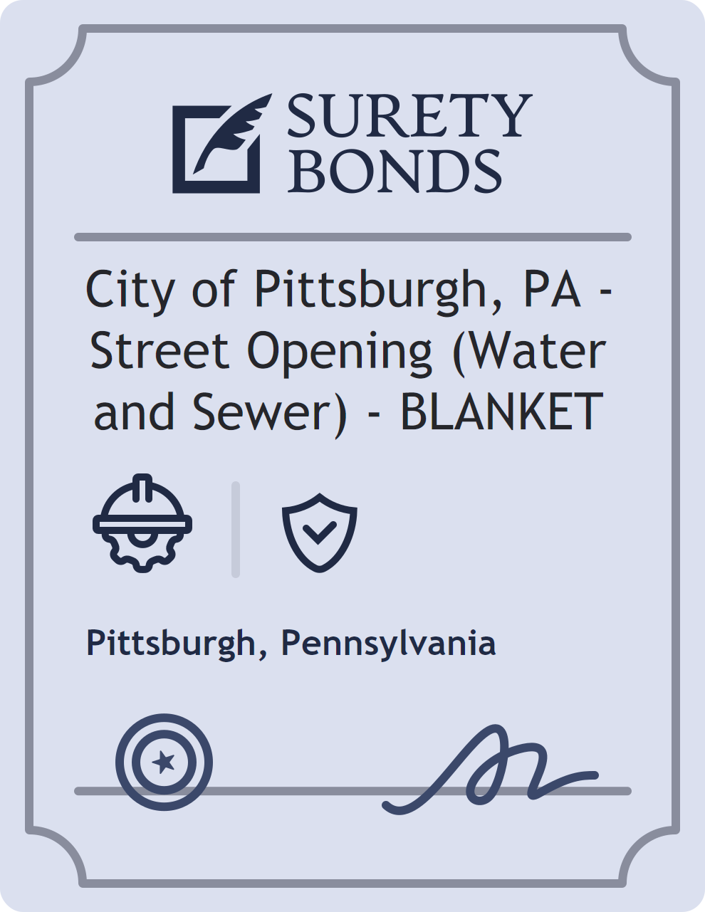 The City of Pittsburgh, PA – Street Opening (Water and Sewer) – BLANKET is classified as a Contractor Bonds with a $10,000 obligation in Pennsylvania. Contractor Bonds are surety bonds required for individuals or businesses performing construction work. They guarantee that contractors will comply with building codes, licensing requirements, and contractual obligations. The bond provides financial protection to property owners and the public in cases of poor workmanship, regulatory violations, or unfinished work. The surety reviews financial strength, compliance history, and indemnity support before approving the obligation. Maintaining uninterrupted coverage for the entire 1 Year term is essential; lapses can trigger penalties, contract defaults, or license suspension in Pennsylvania. Underwriters typically request financial statements, references, and proof of licensing before quoting terms so they can evaluate repayment capacity. Throughout the bond term, the principal must maintain accurate books, respond to regulator inquiries, and remediate any complaints to prevent a claim. Many authorities in Pennsylvania also require renewal certificates 30 to 60 days in advance, and failure to provide proof can halt permitting or bid submissions. The $10,000 limit demonstrates to customers, partners, and oversight agencies that the bonded party maintains a reliable, surety-backed source of funds dedicated to ongoing compliance. The obligee for this bond is Pittsburgh.