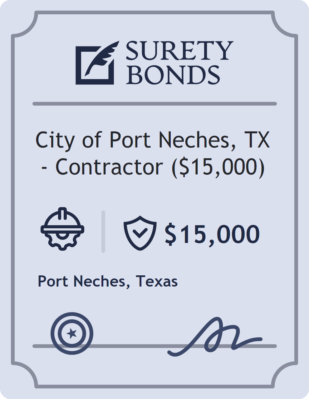 The City of Port Neches, TX – Contractor ($15,000) is classified as a Contractor Bonds with a $15,000 obligation in Texas. Contractor Bonds are surety bonds required for individuals or businesses performing construction work. They guarantee that contractors will comply with building codes, licensing requirements, and contractual obligations. The bond provides financial protection to property owners and the public in cases of poor workmanship, regulatory violations, or unfinished work. The surety reviews financial strength, compliance history, and indemnity support before approving the obligation. Maintaining uninterrupted coverage for the entire 1 Year term is essential; lapses can trigger penalties, contract defaults, or license suspension in Texas. Underwriters typically request financial statements, references, and proof of licensing before quoting terms so they can evaluate repayment capacity. Throughout the bond term, the principal must maintain accurate books, respond to regulator inquiries, and remediate any complaints to prevent a claim. Many authorities in Texas also require renewal certificates 30 to 60 days in advance, and failure to provide proof can halt permitting or bid submissions. The $15,000 limit demonstrates to customers, partners, and oversight agencies that the bonded party maintains a reliable, surety-backed source of funds dedicated to ongoing compliance. The obligee for this bond is Port Neches.
