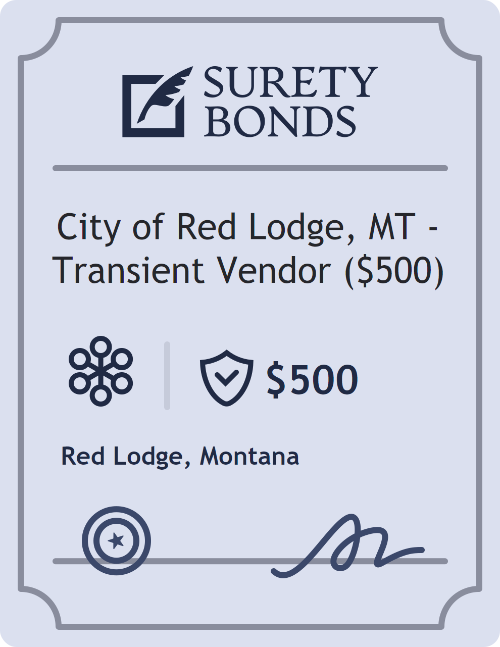 The City of Red Lodge, MT – Transient Vendor ($500) is classified as a Miscellaneous Bonds with a $500 obligation in Montana. Miscellaneous Bonds cover a wide range of non-standard surety bond requirements. They act as financial protection in cases where state or federal regulations require assurance of compliance and ethical conduct. The surety reviews financial strength, compliance history, and indemnity support before approving the obligation. Maintaining uninterrupted coverage for the entire 1 Year term is essential; lapses can trigger penalties, contract defaults, or license suspension in Montana. Underwriters typically request financial statements, references, and proof of licensing before quoting terms so they can evaluate repayment capacity. Throughout the bond term, the principal must maintain accurate books, respond to regulator inquiries, and remediate any complaints to prevent a claim. Many authorities in Montana also require renewal certificates 30 to 60 days in advance, and failure to provide proof can halt permitting or bid submissions. The $500 limit demonstrates to customers, partners, and oversight agencies that the bonded party maintains a reliable, surety-backed source of funds dedicated to ongoing compliance. The obligee for this bond is Red Lodge.