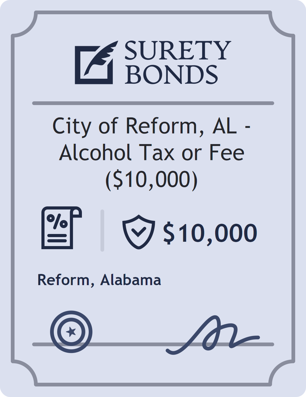 The City of Reform, AL – Alcohol Tax or Fee ($10,000) is classified as a Sales Tax Bonds with a $10,000 obligation in Alabama. Sales Tax Bonds are surety bonds required for businesses responsible for collecting and remitting sales tax. They guarantee that the business will pay taxes owed to the state, ensuring compliance with tax laws. The surety reviews financial strength, compliance history, and indemnity support before approving the obligation. Maintaining uninterrupted coverage for the entire 1 Year term is essential; lapses can trigger penalties, contract defaults, or license suspension in Alabama. Underwriters typically request financial statements, references, and proof of licensing before quoting terms so they can evaluate repayment capacity. Throughout the bond term, the principal must maintain accurate books, respond to regulator inquiries, and remediate any complaints to prevent a claim. Many authorities in Alabama also require renewal certificates 30 to 60 days in advance, and failure to provide proof can halt permitting or bid submissions. The $10,000 limit demonstrates to customers, partners, and oversight agencies that the bonded party maintains a reliable, surety-backed source of funds dedicated to ongoing compliance. The obligee for this bond is Reform.