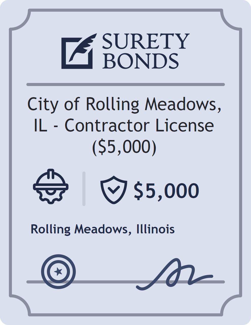 The City of Rolling Meadows, IL – Contractor License ($5,000) is classified as a Contractor Bonds with a $5,000 obligation in Illinois. Contractor Bonds are surety bonds required for individuals or businesses performing construction work. They guarantee that contractors will comply with building codes, licensing requirements, and contractual obligations. The bond provides financial protection to property owners and the public in cases of poor workmanship, regulatory violations, or unfinished work. The surety reviews financial strength, compliance history, and indemnity support before approving the obligation. Maintaining uninterrupted coverage for the entire 1 Year term is essential; lapses can trigger penalties, contract defaults, or license suspension in Illinois. Underwriters typically request financial statements, references, and proof of licensing before quoting terms so they can evaluate repayment capacity. Throughout the bond term, the principal must maintain accurate books, respond to regulator inquiries, and remediate any complaints to prevent a claim. Many authorities in Illinois also require renewal certificates 30 to 60 days in advance, and failure to provide proof can halt permitting or bid submissions. The $5,000 limit demonstrates to customers, partners, and oversight agencies that the bonded party maintains a reliable, surety-backed source of funds dedicated to ongoing compliance. The obligee for this bond is Rolling Meadows.