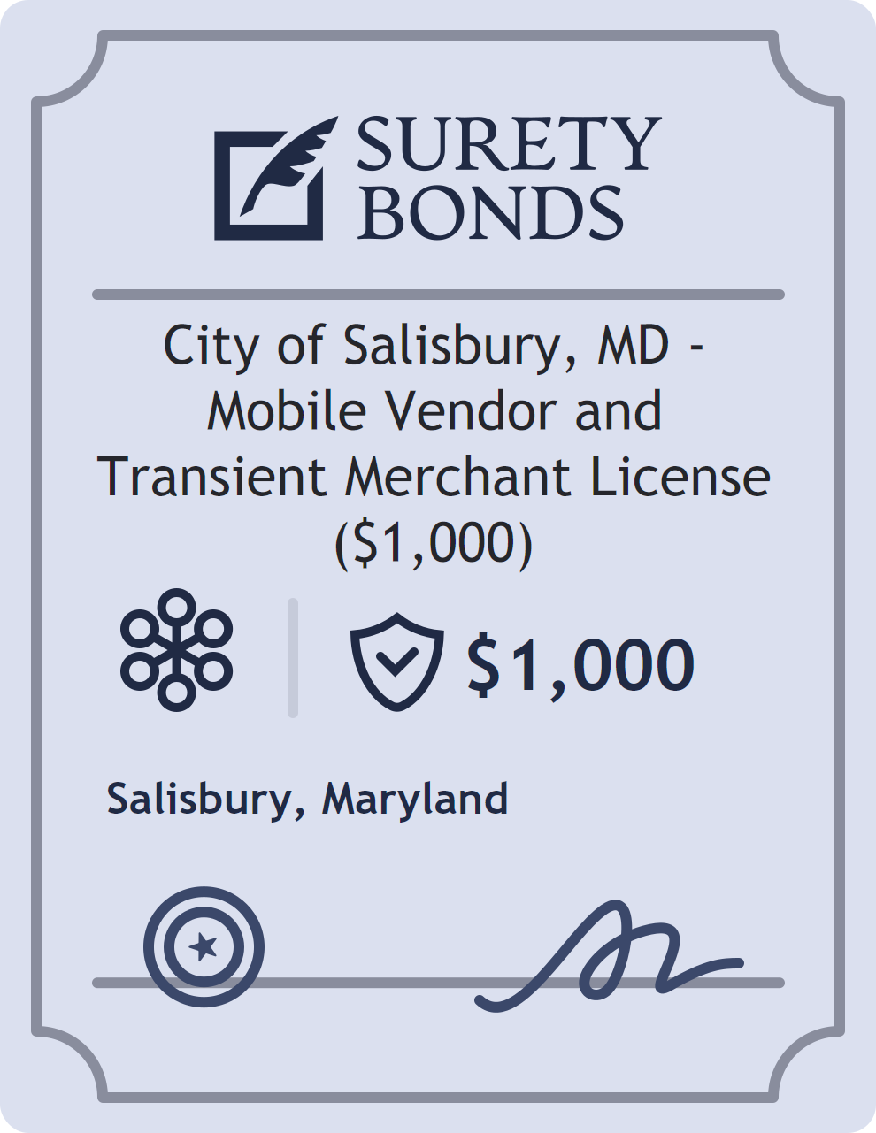 The City of Salisbury, MD – Mobile Vendor and Transient Merchant License ($1,000) is classified as a Miscellaneous Bonds with a $1,000 obligation in Maryland. Miscellaneous Bonds cover a wide range of non-standard surety bond requirements. They act as financial protection in cases where state or federal regulations require assurance of compliance and ethical conduct. The surety reviews financial strength, compliance history, and indemnity support before approving the obligation. Maintaining uninterrupted coverage for the entire 1 Year term is essential; lapses can trigger penalties, contract defaults, or license suspension in Maryland. Underwriters typically request financial statements, references, and proof of licensing before quoting terms so they can evaluate repayment capacity. Throughout the bond term, the principal must maintain accurate books, respond to regulator inquiries, and remediate any complaints to prevent a claim. Many authorities in Maryland also require renewal certificates 30 to 60 days in advance, and failure to provide proof can halt permitting or bid submissions. The $1,000 limit demonstrates to customers, partners, and oversight agencies that the bonded party maintains a reliable, surety-backed source of funds dedicated to ongoing compliance. The obligee for this bond is Salisbury.