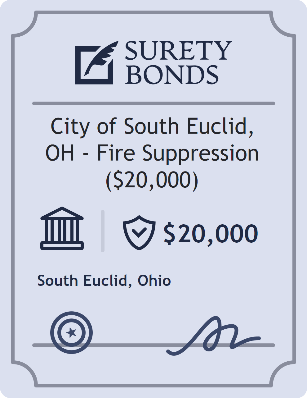 The City of South Euclid, OH – Fire Suppression ($20,000) is classified as a Government/Public Official Bonds with a $20,000 obligation in Ohio. Government/Public Official Bonds are surety bonds that ensure elected and appointed officials perform their duties faithfully and in accordance with the law. These bonds provide financial protection in cases of misconduct, negligence, or misuse of authority by public officials. The surety reviews financial strength, compliance history, and indemnity support before approving the obligation. Maintaining uninterrupted coverage for the entire 1 Year term is essential; lapses can trigger penalties, contract defaults, or license suspension in Ohio. Underwriters typically request financial statements, references, and proof of licensing before quoting terms so they can evaluate repayment capacity. Throughout the bond term, the principal must maintain accurate books, respond to regulator inquiries, and remediate any complaints to prevent a claim. Many authorities in Ohio also require renewal certificates 30 to 60 days in advance, and failure to provide proof can halt permitting or bid submissions. The $20,000 limit demonstrates to customers, partners, and oversight agencies that the bonded party maintains a reliable, surety-backed source of funds dedicated to ongoing compliance. The obligee for this bond is South Euclid.