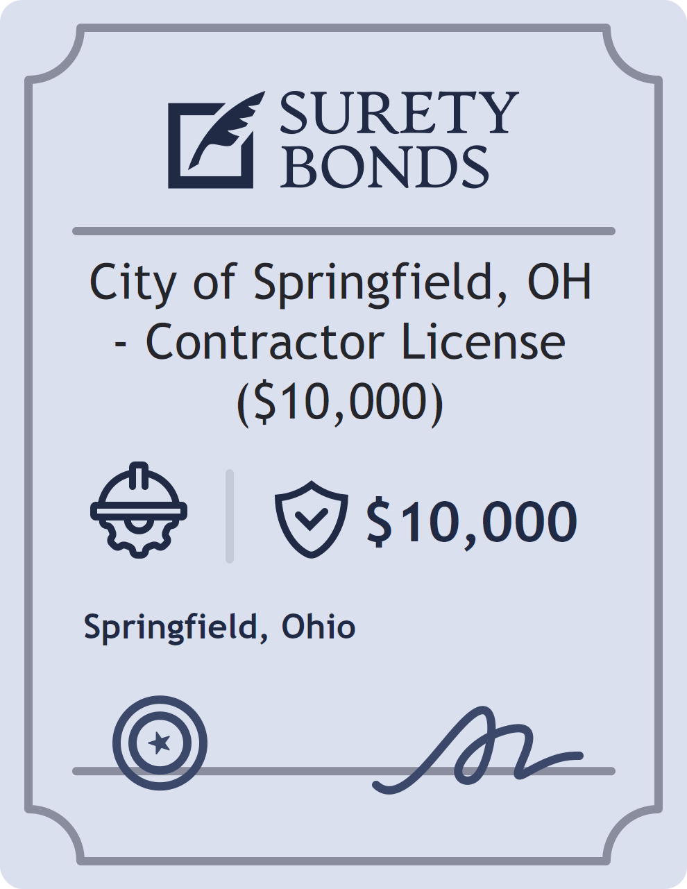 The City of Springfield, OH – Contractor License ($10,000) is classified as a Contractor Bonds with a $10,000 obligation in Ohio. Contractor Bonds are surety bonds required for individuals or businesses performing construction work. They guarantee that contractors will comply with building codes, licensing requirements, and contractual obligations. The bond provides financial protection to property owners and the public in cases of poor workmanship, regulatory violations, or unfinished work. The surety reviews financial strength, compliance history, and indemnity support before approving the obligation. Maintaining uninterrupted coverage for the entire 1 Year term is essential; lapses can trigger penalties, contract defaults, or license suspension in Ohio. Underwriters typically request financial statements, references, and proof of licensing before quoting terms so they can evaluate repayment capacity. Throughout the bond term, the principal must maintain accurate books, respond to regulator inquiries, and remediate any complaints to prevent a claim. Many authorities in Ohio also require renewal certificates 30 to 60 days in advance, and failure to provide proof can halt permitting or bid submissions. The $10,000 limit demonstrates to customers, partners, and oversight agencies that the bonded party maintains a reliable, surety-backed source of funds dedicated to ongoing compliance. The obligee for this bond is Springfield.