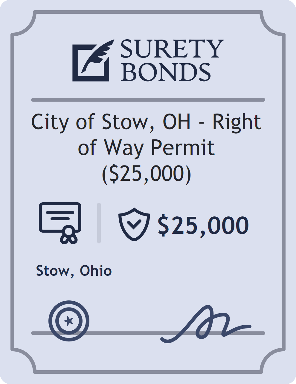 The City of Stow, OH – Right of Way Permit ($25,000) is classified as a Professional License Bonds with a $25,000 obligation in Ohio. Professional License Bonds are surety bonds required for licensed professionals across various industries. They guarantee compliance with licensing laws and ethical standards, protecting clients and regulatory bodies from harm. The surety reviews financial strength, compliance history, and indemnity support before approving the obligation. Maintaining uninterrupted coverage for the entire 1 Year term is essential; lapses can trigger penalties, contract defaults, or license suspension in Ohio. Underwriters typically request financial statements, references, and proof of licensing before quoting terms so they can evaluate repayment capacity. Throughout the bond term, the principal must maintain accurate books, respond to regulator inquiries, and remediate any complaints to prevent a claim. Many authorities in Ohio also require renewal certificates 30 to 60 days in advance, and failure to provide proof can halt permitting or bid submissions. The $25,000 limit demonstrates to customers, partners, and oversight agencies that the bonded party maintains a reliable, surety-backed source of funds dedicated to ongoing compliance. The obligee for this bond is Stow.