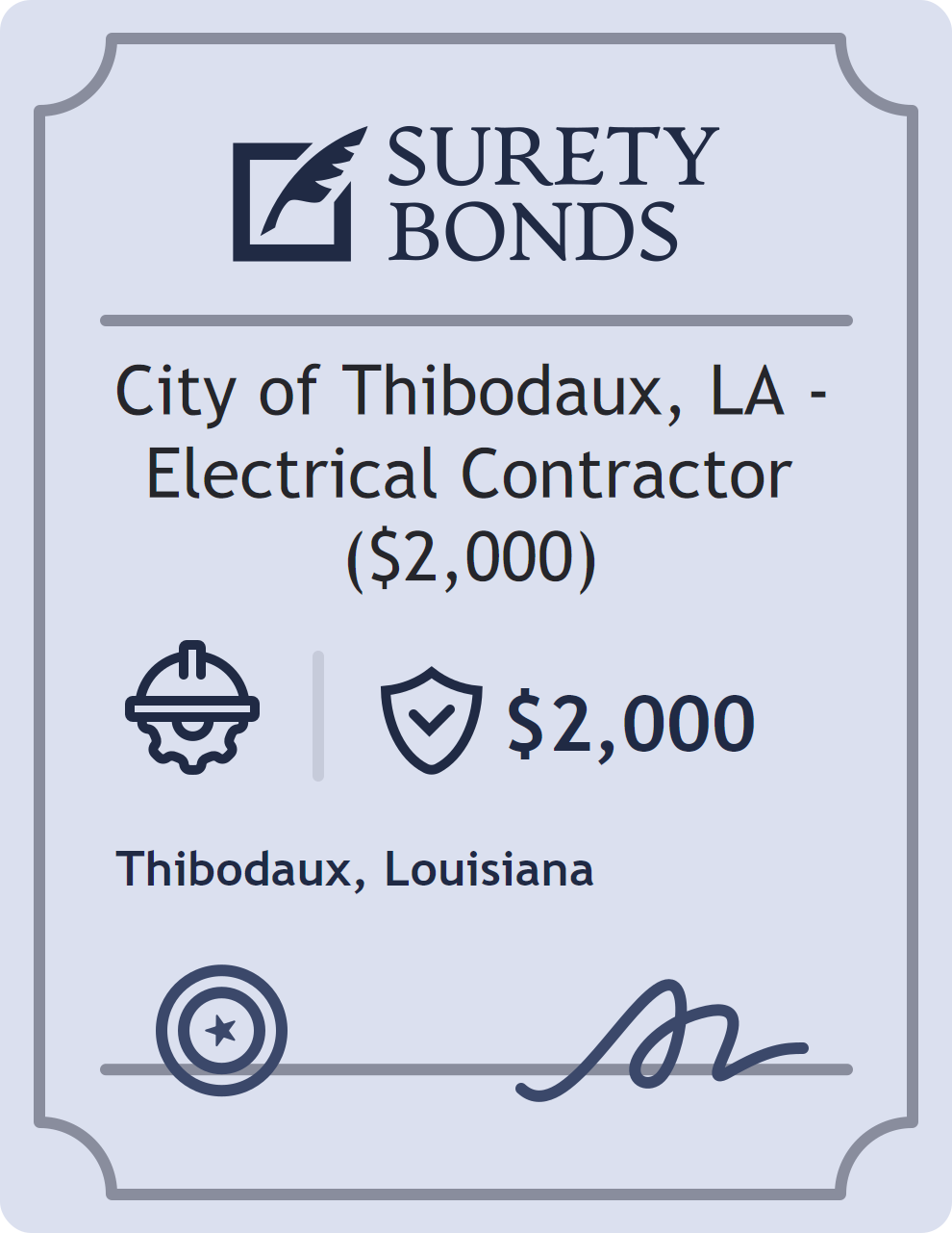 The City of Thibodaux, LA – Electrical Contractor ($2,000) is classified as a Contractor Bonds with a $2,000 obligation in Louisiana. Contractor Bonds are surety bonds required for individuals or businesses performing construction work. They guarantee that contractors will comply with building codes, licensing requirements, and contractual obligations. The bond provides financial protection to property owners and the public in cases of poor workmanship, regulatory violations, or unfinished work. The surety reviews financial strength, compliance history, and indemnity support before approving the obligation. Maintaining uninterrupted coverage for the entire 1 Year term is essential; lapses can trigger penalties, contract defaults, or license suspension in Louisiana. Underwriters typically request financial statements, references, and proof of licensing before quoting terms so they can evaluate repayment capacity. Throughout the bond term, the principal must maintain accurate books, respond to regulator inquiries, and remediate any complaints to prevent a claim. Many authorities in Louisiana also require renewal certificates 30 to 60 days in advance, and failure to provide proof can halt permitting or bid submissions. The $2,000 limit demonstrates to customers, partners, and oversight agencies that the bonded party maintains a reliable, surety-backed source of funds dedicated to ongoing compliance. The obligee for this bond is Thibodaux.