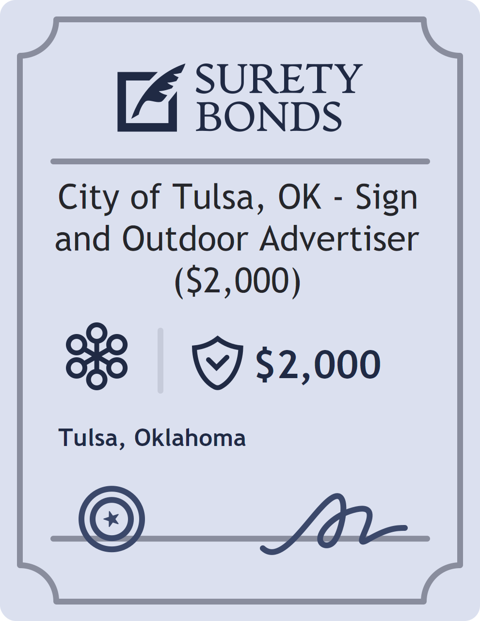 The City of Tulsa, OK – Sign and Outdoor Advertiser ($2,000) is classified as a Miscellaneous Bonds with a $2,000 obligation in Oklahoma. Miscellaneous Bonds cover a wide range of non-standard surety bond requirements. They act as financial protection in cases where state or federal regulations require assurance of compliance and ethical conduct. The surety reviews financial strength, compliance history, and indemnity support before approving the obligation. Maintaining uninterrupted coverage for the entire 1 Year term is essential; lapses can trigger penalties, contract defaults, or license suspension in Oklahoma. Underwriters typically request financial statements, references, and proof of licensing before quoting terms so they can evaluate repayment capacity. Throughout the bond term, the principal must maintain accurate books, respond to regulator inquiries, and remediate any complaints to prevent a claim. Many authorities in Oklahoma also require renewal certificates 30 to 60 days in advance, and failure to provide proof can halt permitting or bid submissions. The $2,000 limit demonstrates to customers, partners, and oversight agencies that the bonded party maintains a reliable, surety-backed source of funds dedicated to ongoing compliance. The obligee for this bond is Tulsa.