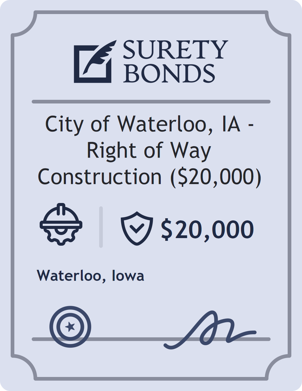 The City of Waterloo, IA – Right of Way Construction ($20,000) is classified as a Contractor Bonds with a $20,000 obligation in Iowa. Contractor Bonds are surety bonds required for individuals or businesses performing construction work. They guarantee that contractors will comply with building codes, licensing requirements, and contractual obligations. The bond provides financial protection to property owners and the public in cases of poor workmanship, regulatory violations, or unfinished work. The surety reviews financial strength, compliance history, and indemnity support before approving the obligation. Maintaining uninterrupted coverage for the entire 1 Year term is essential; lapses can trigger penalties, contract defaults, or license suspension in Iowa. Underwriters typically request financial statements, references, and proof of licensing before quoting terms so they can evaluate repayment capacity. Throughout the bond term, the principal must maintain accurate books, respond to regulator inquiries, and remediate any complaints to prevent a claim. Many authorities in Iowa also require renewal certificates 30 to 60 days in advance, and failure to provide proof can halt permitting or bid submissions. The $20,000 limit demonstrates to customers, partners, and oversight agencies that the bonded party maintains a reliable, surety-backed source of funds dedicated to ongoing compliance. The obligee for this bond is Waterloo.