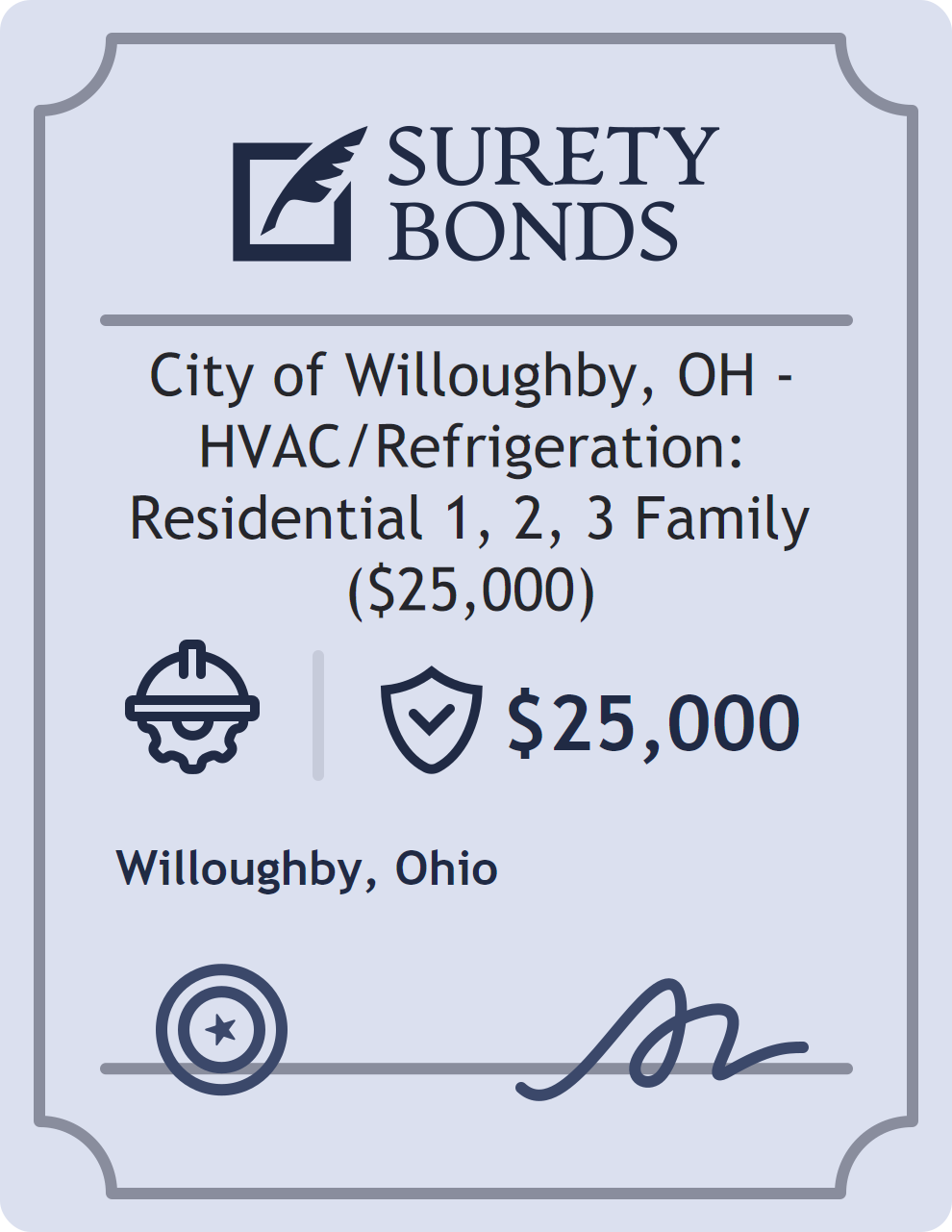 The City of Willoughby, OH – HVAC/Refrigeration: Residential 1, 2, 3 Family ($25,000) is classified as a Contractor Bonds with a $25,000 obligation in Ohio. Contractor Bonds are surety bonds required for individuals or businesses performing construction work. They guarantee that contractors will comply with building codes, licensing requirements, and contractual obligations. The bond provides financial protection to property owners and the public in cases of poor workmanship, regulatory violations, or unfinished work. The surety reviews financial strength, compliance history, and indemnity support before approving the obligation. Maintaining uninterrupted coverage for the entire 1 Year term is essential; lapses can trigger penalties, contract defaults, or license suspension in Ohio. Underwriters typically request financial statements, references, and proof of licensing before quoting terms so they can evaluate repayment capacity. Throughout the bond term, the principal must maintain accurate books, respond to regulator inquiries, and remediate any complaints to prevent a claim. Many authorities in Ohio also require renewal certificates 30 to 60 days in advance, and failure to provide proof can halt permitting or bid submissions. The $25,000 limit demonstrates to customers, partners, and oversight agencies that the bonded party maintains a reliable, surety-backed source of funds dedicated to ongoing compliance. The obligee for this bond is Willoughby.
