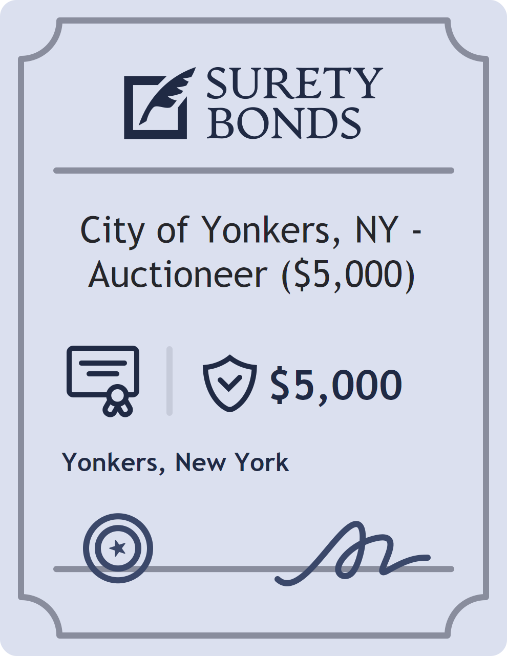 The City of Yonkers, NY – Auctioneer ($5,000) is classified as a Professional License Bonds with a $5,000 obligation in New York. Professional License Bonds are surety bonds required for licensed professionals across various industries. They guarantee compliance with licensing laws and ethical standards, protecting clients and regulatory bodies from harm. The surety reviews financial strength, compliance history, and indemnity support before approving the obligation. Maintaining uninterrupted coverage for the entire 1 Year term is essential; lapses can trigger penalties, contract defaults, or license suspension in New York. Underwriters typically request financial statements, references, and proof of licensing before quoting terms so they can evaluate repayment capacity. Throughout the bond term, the principal must maintain accurate books, respond to regulator inquiries, and remediate any complaints to prevent a claim. Many authorities in New York also require renewal certificates 30 to 60 days in advance, and failure to provide proof can halt permitting or bid submissions. The $5,000 limit demonstrates to customers, partners, and oversight agencies that the bonded party maintains a reliable, surety-backed source of funds dedicated to ongoing compliance. The obligee for this bond is Yonkers.