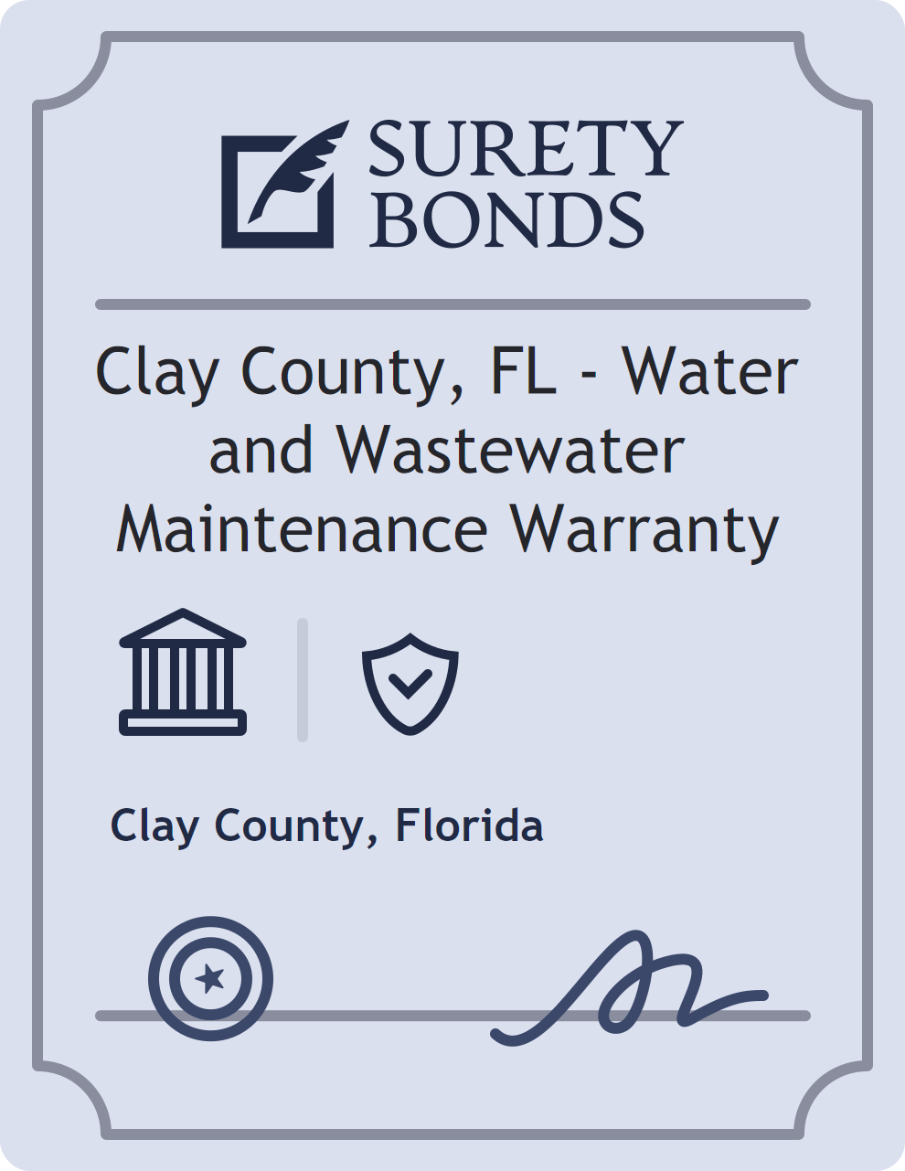 The Clay County, FL – Water and Wastewater Maintenance Warranty is classified as a Government/Public Official Bonds with a $10,000 obligation in Florida. Government/Public Official Bonds are surety bonds that ensure elected and appointed officials perform their duties faithfully and in accordance with the law. These bonds provide financial protection in cases of misconduct, negligence, or misuse of authority by public officials. The surety reviews financial strength, compliance history, and indemnity support before approving the obligation. Maintaining uninterrupted coverage for the entire 1 Year term is essential; lapses can trigger penalties, contract defaults, or license suspension in Florida. Underwriters typically request financial statements, references, and proof of licensing before quoting terms so they can evaluate repayment capacity. Throughout the bond term, the principal must maintain accurate books, respond to regulator inquiries, and remediate any complaints to prevent a claim. Many authorities in Florida also require renewal certificates 30 to 60 days in advance, and failure to provide proof can halt permitting or bid submissions. The $10,000 limit demonstrates to customers, partners, and oversight agencies that the bonded party maintains a reliable, surety-backed source of funds dedicated to ongoing compliance. The obligee for this bond is Clay County.