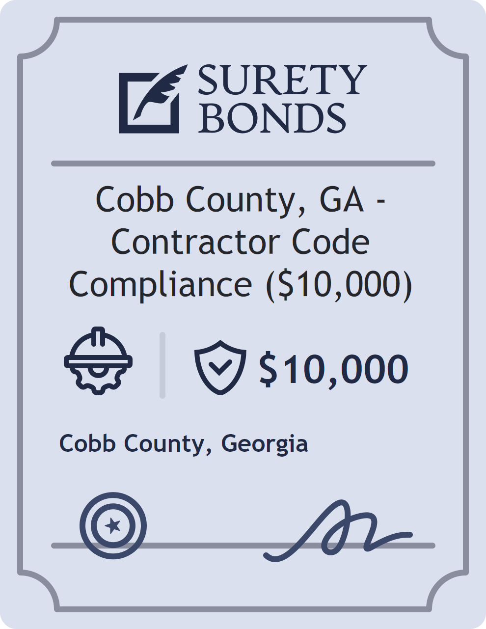 The Cobb County, GA – Contractor Code Compliance ($10,000) is classified as a Contractor Bonds with a $10,000 obligation in Georgia. Contractor Bonds are surety bonds required for individuals or businesses performing construction work. They guarantee that contractors will comply with building codes, licensing requirements, and contractual obligations. The bond provides financial protection to property owners and the public in cases of poor workmanship, regulatory violations, or unfinished work. The surety reviews financial strength, compliance history, and indemnity support before approving the obligation. Maintaining uninterrupted coverage for the entire 1 Year term is essential; lapses can trigger penalties, contract defaults, or license suspension in Georgia. Underwriters typically request financial statements, references, and proof of licensing before quoting terms so they can evaluate repayment capacity. Throughout the bond term, the principal must maintain accurate books, respond to regulator inquiries, and remediate any complaints to prevent a claim. Many authorities in Georgia also require renewal certificates 30 to 60 days in advance, and failure to provide proof can halt permitting or bid submissions. The $10,000 limit demonstrates to customers, partners, and oversight agencies that the bonded party maintains a reliable, surety-backed source of funds dedicated to ongoing compliance. The obligee for this bond is Cobb County.