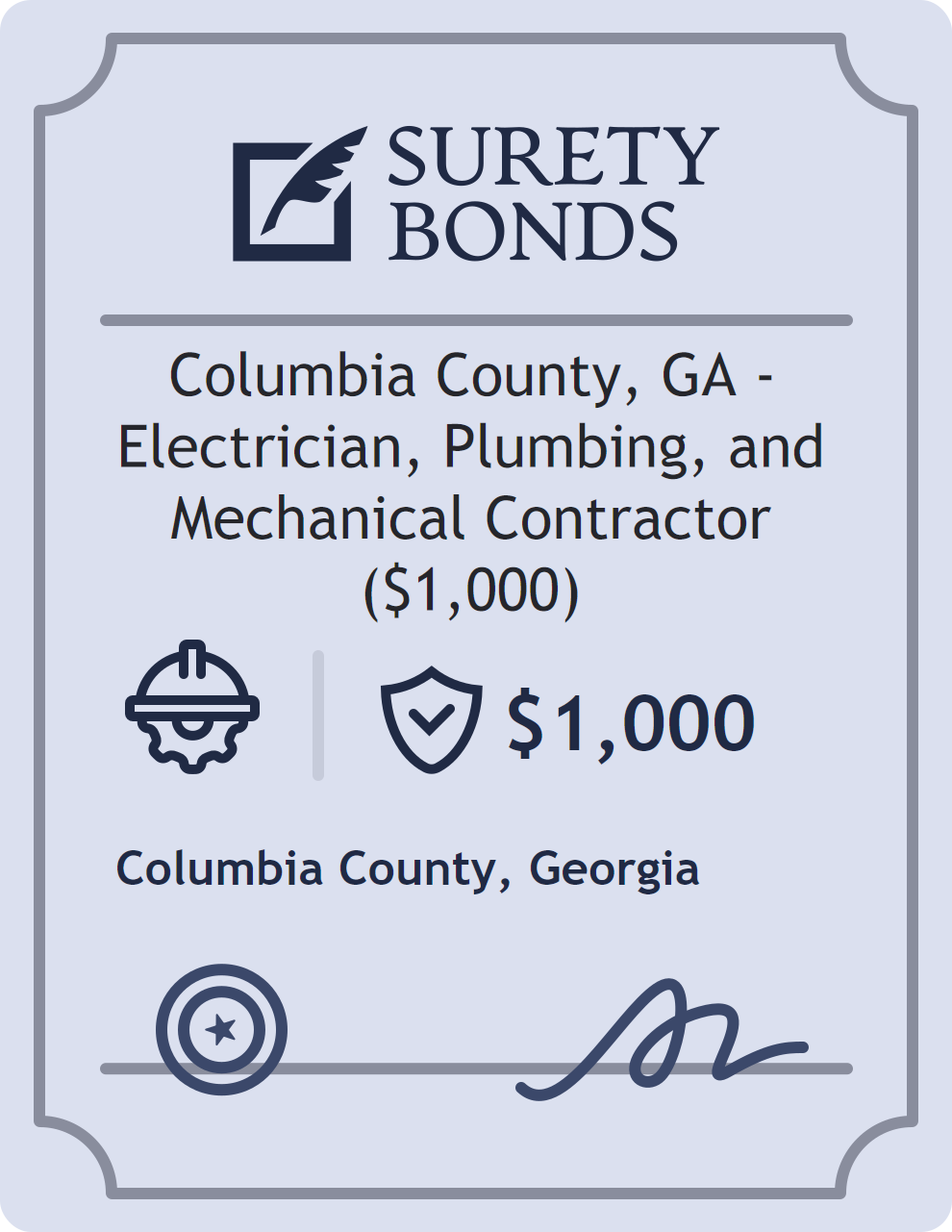 The Columbia County, GA – Electrician, Plumbing, and Mechanical Contractor ($1,000) is classified as a Contractor Bonds with a $1,000 obligation in Georgia. Contractor Bonds are surety bonds required for individuals or businesses performing construction work. They guarantee that contractors will comply with building codes, licensing requirements, and contractual obligations. The bond provides financial protection to property owners and the public in cases of poor workmanship, regulatory violations, or unfinished work. The surety reviews financial strength, compliance history, and indemnity support before approving the obligation. Maintaining uninterrupted coverage for the entire 1 Year term is essential; lapses can trigger penalties, contract defaults, or license suspension in Georgia. Underwriters typically request financial statements, references, and proof of licensing before quoting terms so they can evaluate repayment capacity. Throughout the bond term, the principal must maintain accurate books, respond to regulator inquiries, and remediate any complaints to prevent a claim. Many authorities in Georgia also require renewal certificates 30 to 60 days in advance, and failure to provide proof can halt permitting or bid submissions. The $1,000 limit demonstrates to customers, partners, and oversight agencies that the bonded party maintains a reliable, surety-backed source of funds dedicated to ongoing compliance. The obligee for this bond is Columbia County.