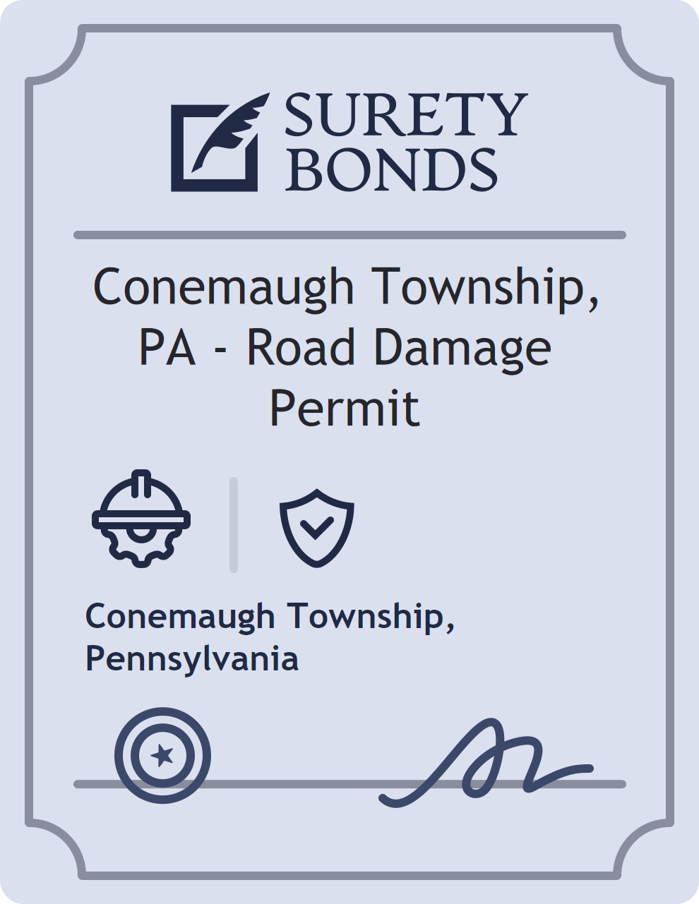 The Conemaugh Township, PA – Road Damage Permit is classified as a Contractor Bonds with a $10,000 obligation in Pennsylvania. Contractor Bonds are surety bonds required for individuals or businesses performing construction work. They guarantee that contractors will comply with building codes, licensing requirements, and contractual obligations. The bond provides financial protection to property owners and the public in cases of poor workmanship, regulatory violations, or unfinished work. The surety reviews financial strength, compliance history, and indemnity support before approving the obligation. Maintaining uninterrupted coverage for the entire 1 Year term is essential; lapses can trigger penalties, contract defaults, or license suspension in Pennsylvania. Underwriters typically request financial statements, references, and proof of licensing before quoting terms so they can evaluate repayment capacity. Throughout the bond term, the principal must maintain accurate books, respond to regulator inquiries, and remediate any complaints to prevent a claim. Many authorities in Pennsylvania also require renewal certificates 30 to 60 days in advance, and failure to provide proof can halt permitting or bid submissions. The $10,000 limit demonstrates to customers, partners, and oversight agencies that the bonded party maintains a reliable, surety-backed source of funds dedicated to ongoing compliance. The obligee for this bond is Conemaugh Township.