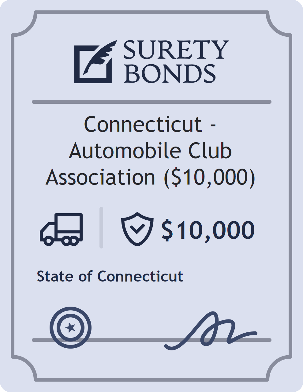 The Connecticut – Automobile Club Association ($10,000) is a $10,000 surety bond required in Connecticut. It provides a financial guarantee that the bonded party will satisfy all statutory and contractual obligations related to this bond type. The surety reviews financial strength, compliance history, and indemnity support before approving the obligation. Maintaining uninterrupted coverage for the entire 1 Year term is essential; lapses can trigger penalties, contract defaults, or license suspension in Connecticut. Underwriters typically request financial statements, references, and proof of licensing before quoting terms so they can evaluate repayment capacity. Throughout the bond term, the principal must maintain accurate books, respond to regulator inquiries, and remediate any complaints to prevent a claim. Many authorities in Connecticut also require renewal certificates 30 to 60 days in advance, and failure to provide proof can halt permitting or bid submissions. The $10,000 limit demonstrates to customers, partners, and oversight agencies that the bonded party maintains a reliable, surety-backed source of funds dedicated to ongoing compliance. The obligee for this bond is State of Connecticut.