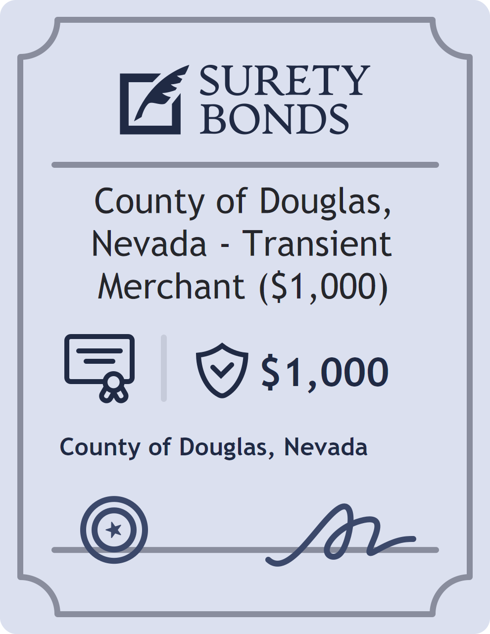 The County of Douglas, Nevada – Transient Merchant ($1,000) is classified as a Professional License Bonds with a $1,000 obligation in Nevada. Professional License Bonds are surety bonds required for licensed professionals across various industries. They guarantee compliance with licensing laws and ethical standards, protecting clients and regulatory bodies from harm. The surety reviews financial strength, compliance history, and indemnity support before approving the obligation. Maintaining uninterrupted coverage for the entire 1 Year term is essential; lapses can trigger penalties, contract defaults, or license suspension in Nevada. Underwriters typically request financial statements, references, and proof of licensing before quoting terms so they can evaluate repayment capacity. Throughout the bond term, the principal must maintain accurate books, respond to regulator inquiries, and remediate any complaints to prevent a claim. Many authorities in Nevada also require renewal certificates 30 to 60 days in advance, and failure to provide proof can halt permitting or bid submissions. The $1,000 limit demonstrates to customers, partners, and oversight agencies that the bonded party maintains a reliable, surety-backed source of funds dedicated to ongoing compliance. The obligee for this bond is County of Douglas.