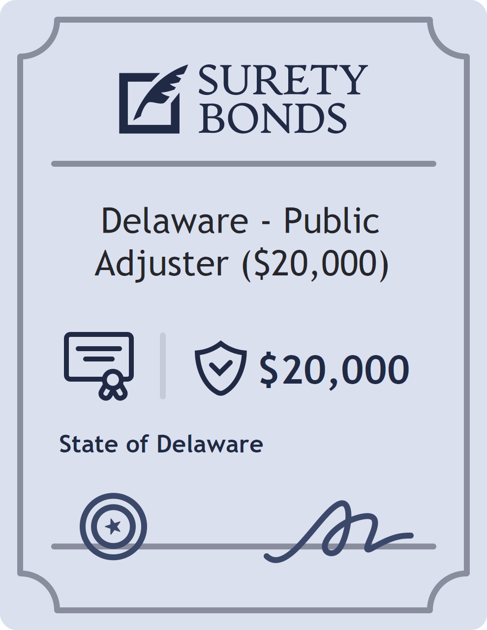The Delaware – Public Adjuster ($20,000) is classified as a Professional License Bonds with a $20,000 obligation in Delaware. Professional License Bonds are surety bonds required for licensed professionals across various industries. They guarantee compliance with licensing laws and ethical standards, protecting clients and regulatory bodies from harm. The surety reviews financial strength, compliance history, and indemnity support before approving the obligation. Maintaining uninterrupted coverage for the entire 1 Year term is essential; lapses can trigger penalties, contract defaults, or license suspension in Delaware. Underwriters typically request financial statements, references, and proof of licensing before quoting terms so they can evaluate repayment capacity. Throughout the bond term, the principal must maintain accurate books, respond to regulator inquiries, and remediate any complaints to prevent a claim. Many authorities in Delaware also require renewal certificates 30 to 60 days in advance, and failure to provide proof can halt permitting or bid submissions. The $20,000 limit demonstrates to customers, partners, and oversight agencies that the bonded party maintains a reliable, surety-backed source of funds dedicated to ongoing compliance. The obligee for this bond is State of Delaware.
