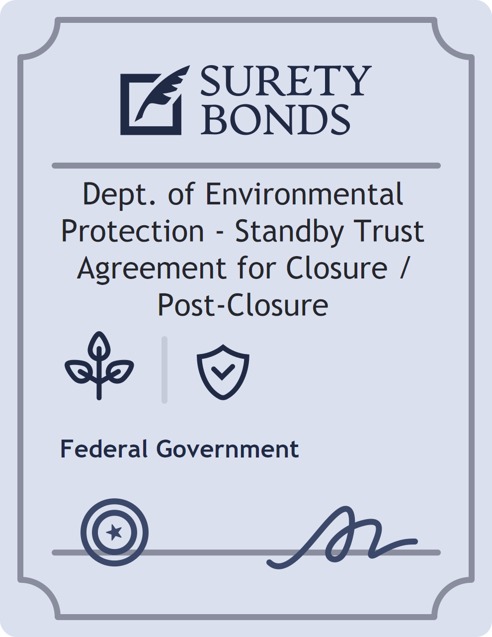 The Dept. of Environmental Protection – Standby Trust Agreement for Closure / Post-Closure is classified as a Environmental Bonds with a $10,000 obligation in Federal. Environmental Bonds are surety bonds required for businesses and contractors engaged in activities that impact the environment, such as waste management, mining, or energy production. These bonds guarantee compliance with environmental regulations and ensure that funds are available for cleanup or remediation if necessary. The surety reviews financial strength, compliance history, and indemnity support before approving the obligation. Maintaining uninterrupted coverage for the entire 1 Year term is essential; lapses can trigger penalties, contract defaults, or license suspension in Federal. Underwriters typically request financial statements, references, and proof of licensing before quoting terms so they can evaluate repayment capacity. Throughout the bond term, the principal must maintain accurate books, respond to regulator inquiries, and remediate any complaints to prevent a claim. Many authorities in Federal also require renewal certificates 30 to 60 days in advance, and failure to provide proof can halt permitting or bid submissions. The $10,000 limit demonstrates to customers, partners, and oversight agencies that the bonded party maintains a reliable, surety-backed source of funds dedicated to ongoing compliance. The obligee for this bond is Dept. of Environmental Protection.