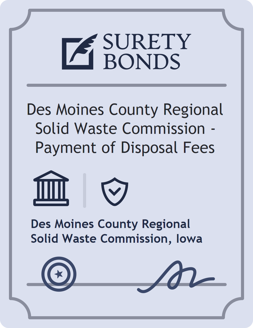 The Des Moines County Regional Solid Waste Commission – Payment of Disposal Fees is classified as a Government/Public Official Bonds with a $10,000 obligation in Iowa. Government/Public Official Bonds are surety bonds that ensure elected and appointed officials perform their duties faithfully and in accordance with the law. These bonds provide financial protection in cases of misconduct, negligence, or misuse of authority by public officials. The surety reviews financial strength, compliance history, and indemnity support before approving the obligation. Maintaining uninterrupted coverage for the entire 1 Year term is essential; lapses can trigger penalties, contract defaults, or license suspension in Iowa. Underwriters typically request financial statements, references, and proof of licensing before quoting terms so they can evaluate repayment capacity. Throughout the bond term, the principal must maintain accurate books, respond to regulator inquiries, and remediate any complaints to prevent a claim. Many authorities in Iowa also require renewal certificates 30 to 60 days in advance, and failure to provide proof can halt permitting or bid submissions. The $10,000 limit demonstrates to customers, partners, and oversight agencies that the bonded party maintains a reliable, surety-backed source of funds dedicated to ongoing compliance. The obligee for this bond is Des Moines County Regional Solid Waste Commission.