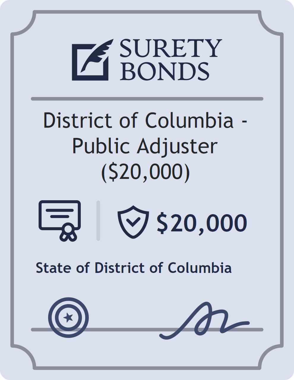 The District of Columbia – Public Adjuster ($20,000) is classified as a Professional License Bonds with a $20,000 obligation in District of Columbia. Professional License Bonds are surety bonds required for licensed professionals across various industries. They guarantee compliance with licensing laws and ethical standards, protecting clients and regulatory bodies from harm. The surety reviews financial strength, compliance history, and indemnity support before approving the obligation. Maintaining uninterrupted coverage for the entire 1 Year term is essential; lapses can trigger penalties, contract defaults, or license suspension in District of Columbia. Underwriters typically request financial statements, references, and proof of licensing before quoting terms so they can evaluate repayment capacity. Throughout the bond term, the principal must maintain accurate books, respond to regulator inquiries, and remediate any complaints to prevent a claim. Many authorities in District of Columbia also require renewal certificates 30 to 60 days in advance, and failure to provide proof can halt permitting or bid submissions. The $20,000 limit demonstrates to customers, partners, and oversight agencies that the bonded party maintains a reliable, surety-backed source of funds dedicated to ongoing compliance. The obligee for this bond is State of District of Columbia.