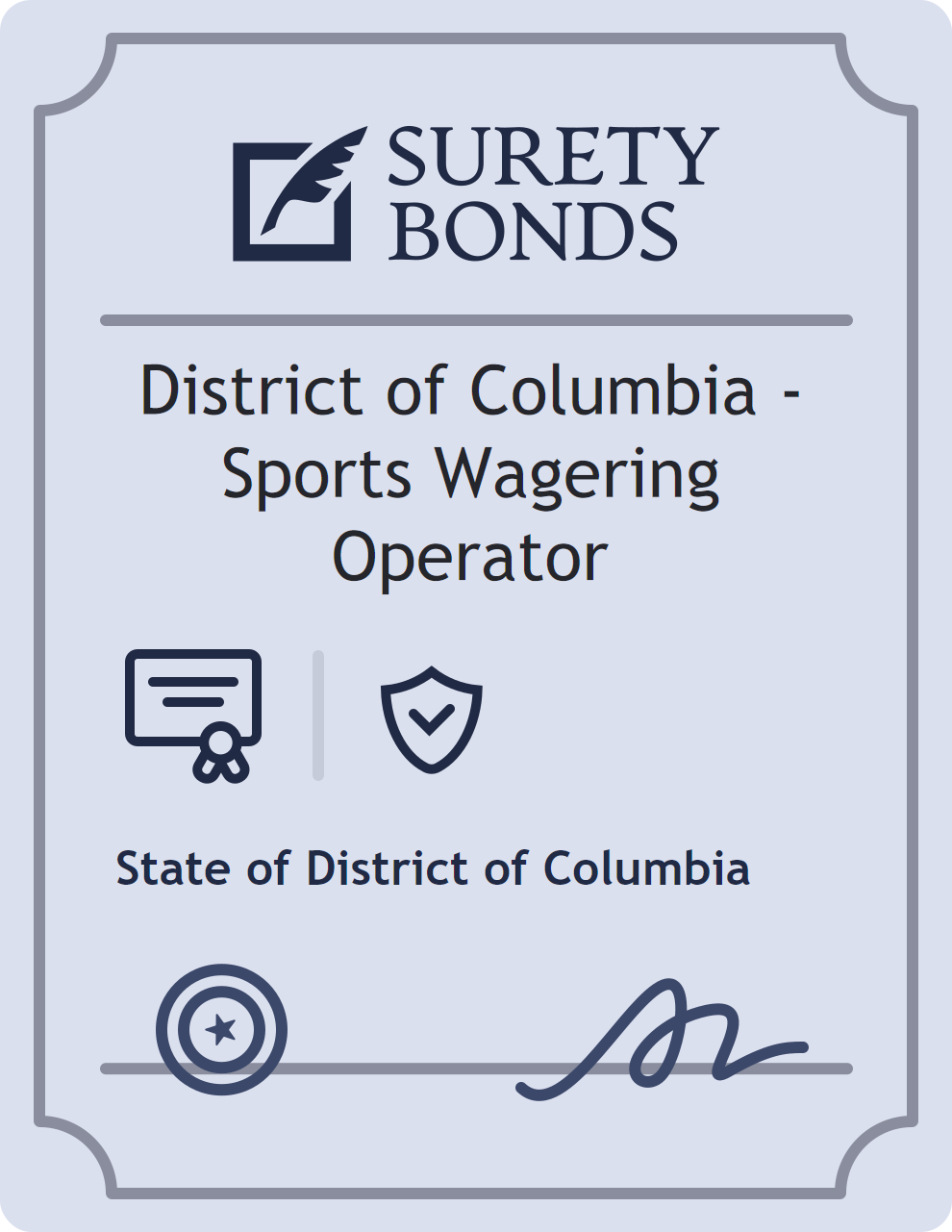 The District of Columbia – Sports Wagering Operator is classified as a Professional License Bonds with a $10,000 obligation in District of Columbia. Professional License Bonds are surety bonds required for licensed professionals across various industries. They guarantee compliance with licensing laws and ethical standards, protecting clients and regulatory bodies from harm. The surety reviews financial strength, compliance history, and indemnity support before approving the obligation. Maintaining uninterrupted coverage for the entire 1 Year term is essential; lapses can trigger penalties, contract defaults, or license suspension in District of Columbia. Underwriters typically request financial statements, references, and proof of licensing before quoting terms so they can evaluate repayment capacity. Throughout the bond term, the principal must maintain accurate books, respond to regulator inquiries, and remediate any complaints to prevent a claim. Many authorities in District of Columbia also require renewal certificates 30 to 60 days in advance, and failure to provide proof can halt permitting or bid submissions. The $10,000 limit demonstrates to customers, partners, and oversight agencies that the bonded party maintains a reliable, surety-backed source of funds dedicated to ongoing compliance. The obligee for this bond is State of District of Columbia.