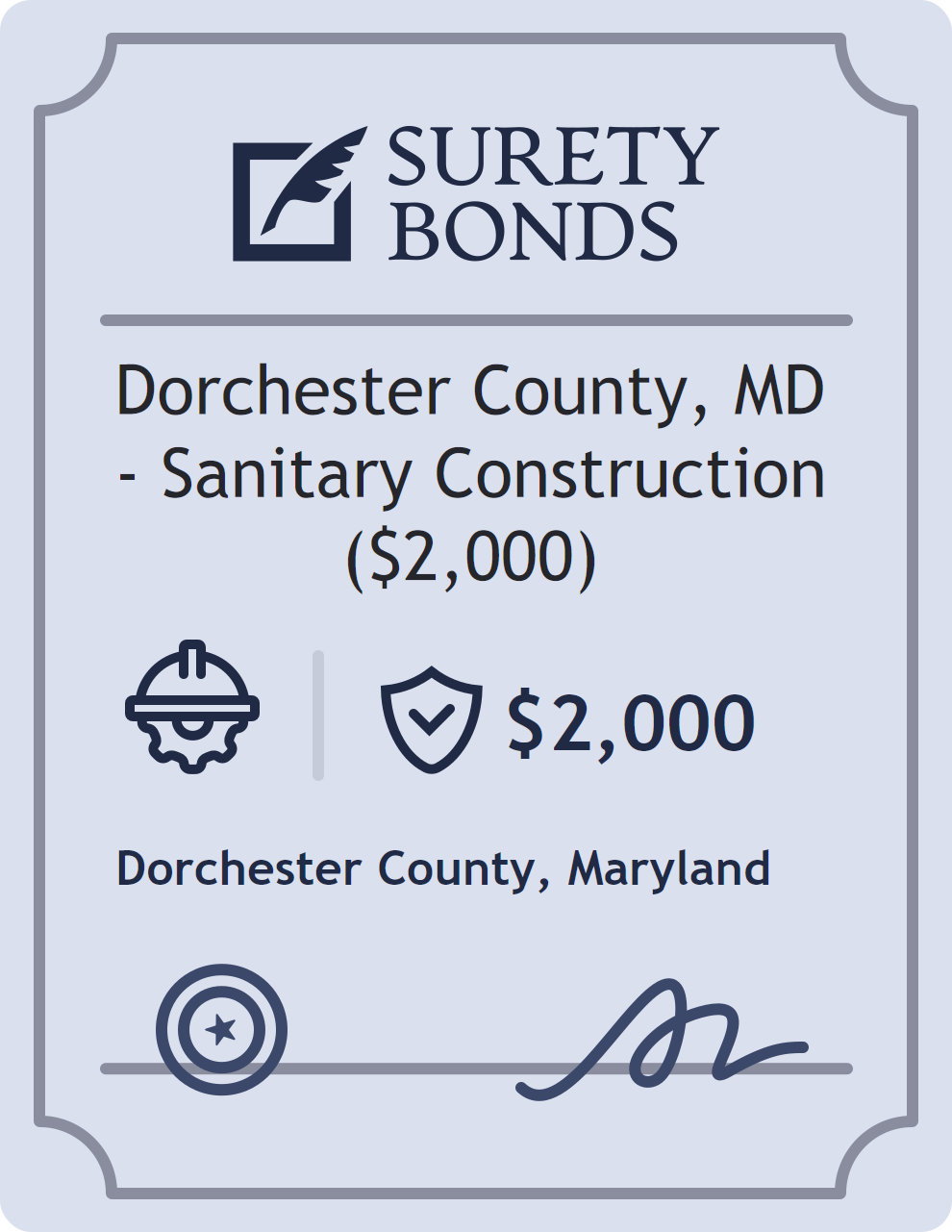 The Dorchester County, MD – Sanitary Construction ($2,000) is classified as a Contractor Bonds with a $2,000 obligation in Maryland. Contractor Bonds are surety bonds required for individuals or businesses performing construction work. They guarantee that contractors will comply with building codes, licensing requirements, and contractual obligations. The bond provides financial protection to property owners and the public in cases of poor workmanship, regulatory violations, or unfinished work. The surety reviews financial strength, compliance history, and indemnity support before approving the obligation. Maintaining uninterrupted coverage for the entire 1 Year term is essential; lapses can trigger penalties, contract defaults, or license suspension in Maryland. Underwriters typically request financial statements, references, and proof of licensing before quoting terms so they can evaluate repayment capacity. Throughout the bond term, the principal must maintain accurate books, respond to regulator inquiries, and remediate any complaints to prevent a claim. Many authorities in Maryland also require renewal certificates 30 to 60 days in advance, and failure to provide proof can halt permitting or bid submissions. The $2,000 limit demonstrates to customers, partners, and oversight agencies that the bonded party maintains a reliable, surety-backed source of funds dedicated to ongoing compliance. The obligee for this bond is Dorchester County.