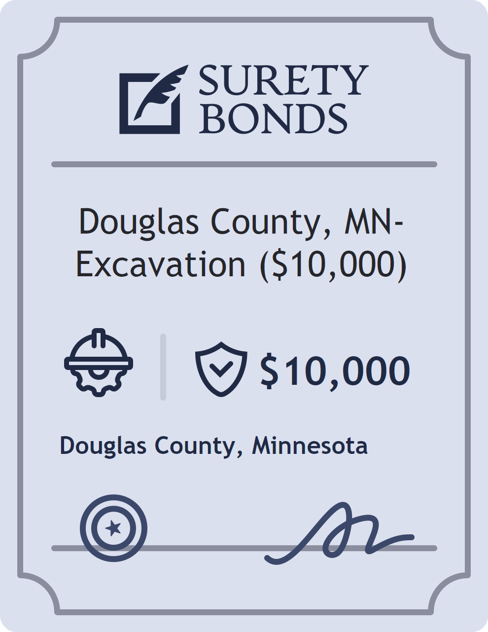 The Douglas County, MN- Excavation ($10,000) is classified as a Contractor Bonds with a $10,000 obligation in Minnesota. Contractor Bonds are surety bonds required for individuals or businesses performing construction work. They guarantee that contractors will comply with building codes, licensing requirements, and contractual obligations. The bond provides financial protection to property owners and the public in cases of poor workmanship, regulatory violations, or unfinished work. The surety reviews financial strength, compliance history, and indemnity support before approving the obligation. Maintaining uninterrupted coverage for the entire 1 Year term is essential; lapses can trigger penalties, contract defaults, or license suspension in Minnesota. Underwriters typically request financial statements, references, and proof of licensing before quoting terms so they can evaluate repayment capacity. Throughout the bond term, the principal must maintain accurate books, respond to regulator inquiries, and remediate any complaints to prevent a claim. Many authorities in Minnesota also require renewal certificates 30 to 60 days in advance, and failure to provide proof can halt permitting or bid submissions. The $10,000 limit demonstrates to customers, partners, and oversight agencies that the bonded party maintains a reliable, surety-backed source of funds dedicated to ongoing compliance. The obligee for this bond is Douglas County.