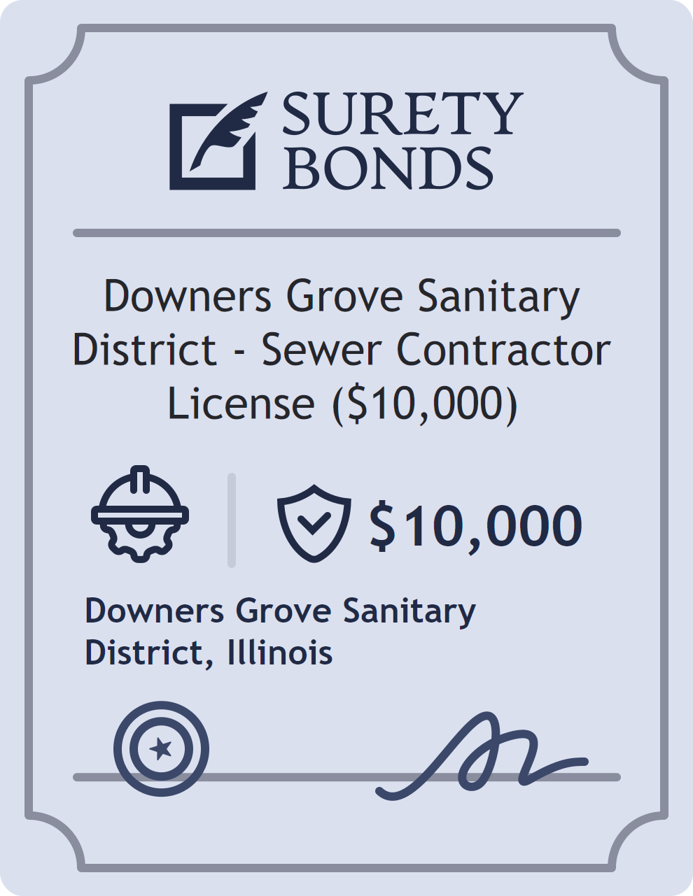 The Downers Grove Sanitary District – Sewer Contractor License ($10,000) is classified as a Contractor Bonds with a $10,000 obligation in Illinois. Contractor Bonds are surety bonds required for individuals or businesses performing construction work. They guarantee that contractors will comply with building codes, licensing requirements, and contractual obligations. The bond provides financial protection to property owners and the public in cases of poor workmanship, regulatory violations, or unfinished work. The surety reviews financial strength, compliance history, and indemnity support before approving the obligation. Maintaining uninterrupted coverage for the entire 1 Year term is essential; lapses can trigger penalties, contract defaults, or license suspension in Illinois. Underwriters typically request financial statements, references, and proof of licensing before quoting terms so they can evaluate repayment capacity. Throughout the bond term, the principal must maintain accurate books, respond to regulator inquiries, and remediate any complaints to prevent a claim. Many authorities in Illinois also require renewal certificates 30 to 60 days in advance, and failure to provide proof can halt permitting or bid submissions. The $10,000 limit demonstrates to customers, partners, and oversight agencies that the bonded party maintains a reliable, surety-backed source of funds dedicated to ongoing compliance. The obligee for this bond is Downers Grove Sanitary District.