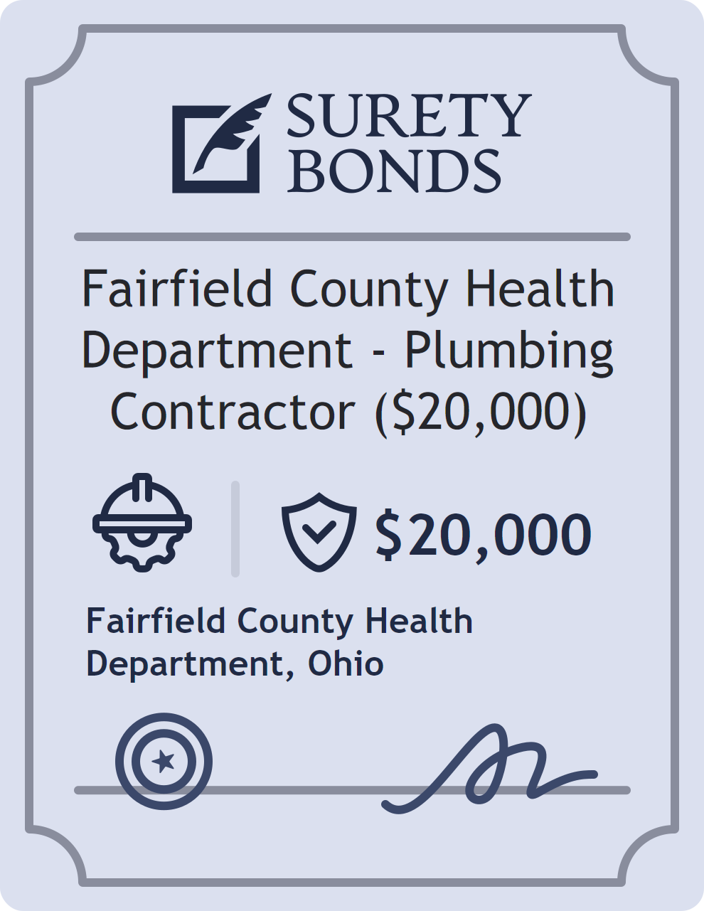 The Fairfield County Health Department – Plumbing Contractor ($20,000) is classified as a Contractor Bonds with a $20,000 obligation in Ohio. Contractor Bonds are surety bonds required for individuals or businesses performing construction work. They guarantee that contractors will comply with building codes, licensing requirements, and contractual obligations. The bond provides financial protection to property owners and the public in cases of poor workmanship, regulatory violations, or unfinished work. The surety reviews financial strength, compliance history, and indemnity support before approving the obligation. Maintaining uninterrupted coverage for the entire 1 Year term is essential; lapses can trigger penalties, contract defaults, or license suspension in Ohio. Underwriters typically request financial statements, references, and proof of licensing before quoting terms so they can evaluate repayment capacity. Throughout the bond term, the principal must maintain accurate books, respond to regulator inquiries, and remediate any complaints to prevent a claim. Many authorities in Ohio also require renewal certificates 30 to 60 days in advance, and failure to provide proof can halt permitting or bid submissions. The $20,000 limit demonstrates to customers, partners, and oversight agencies that the bonded party maintains a reliable, surety-backed source of funds dedicated to ongoing compliance. The obligee for this bond is Fairfield County Health Department.