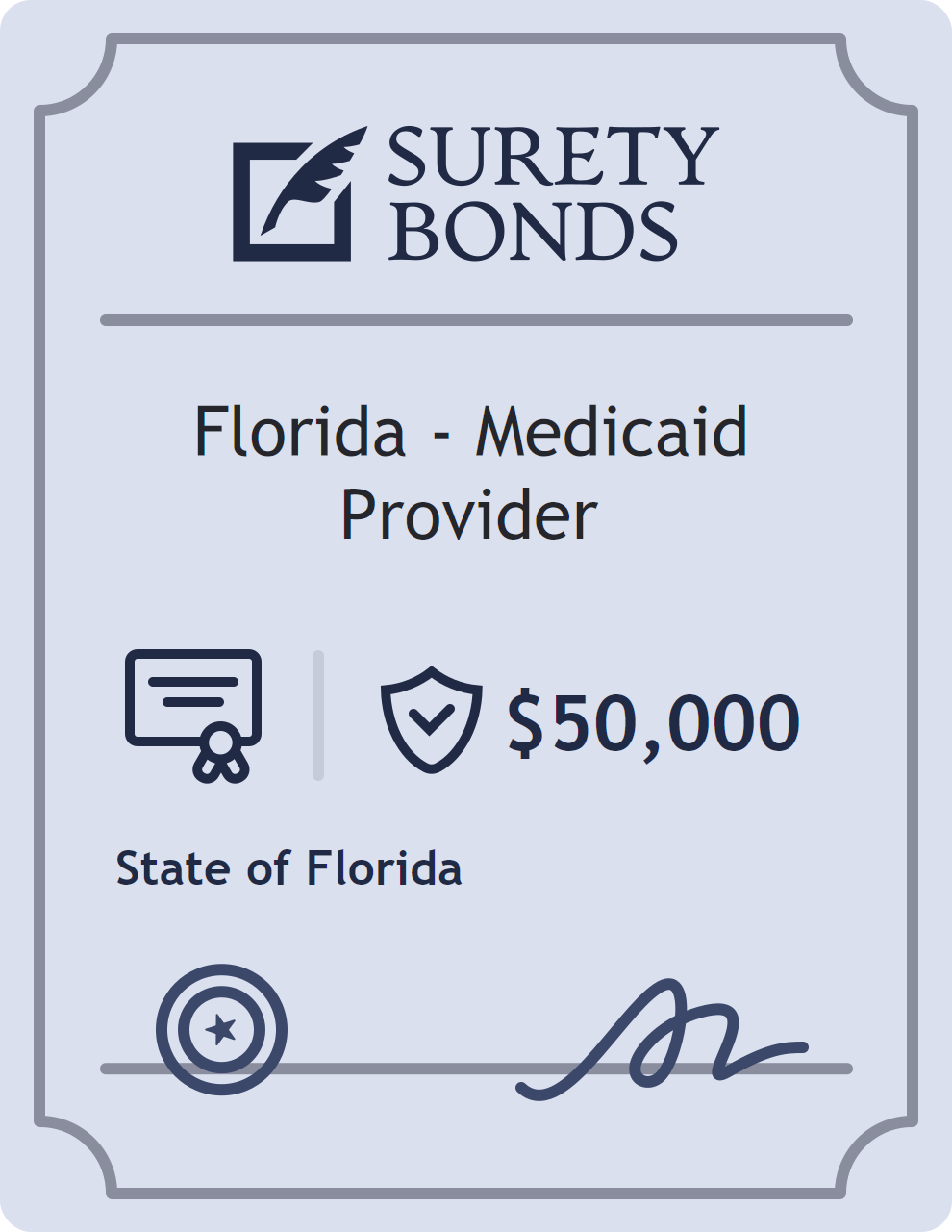 The Florida – Medicaid Provider is classified as a Professional License Bonds with a $50,000.00 obligation in Florida. Professional License Bonds are surety bonds required for licensed professionals across various industries. They guarantee compliance with licensing laws and ethical standards, protecting clients and regulatory bodies from harm. The surety reviews financial strength, compliance history, and indemnity support before approving the obligation. Maintaining uninterrupted coverage for the entire 1 Year term is essential; lapses can trigger penalties, contract defaults, or license suspension in Florida. Underwriters typically request financial statements, references, and proof of licensing before quoting terms so they can evaluate repayment capacity. Throughout the bond term, the principal must maintain accurate books, respond to regulator inquiries, and remediate any complaints to prevent a claim. Many authorities in Florida also require renewal certificates 30 to 60 days in advance, and failure to provide proof can halt permitting or bid submissions. The $50,000.00 limit demonstrates to customers, partners, and oversight agencies that the bonded party maintains a reliable, surety-backed source of funds dedicated to ongoing compliance. The obligee for this bond is State of Florida.