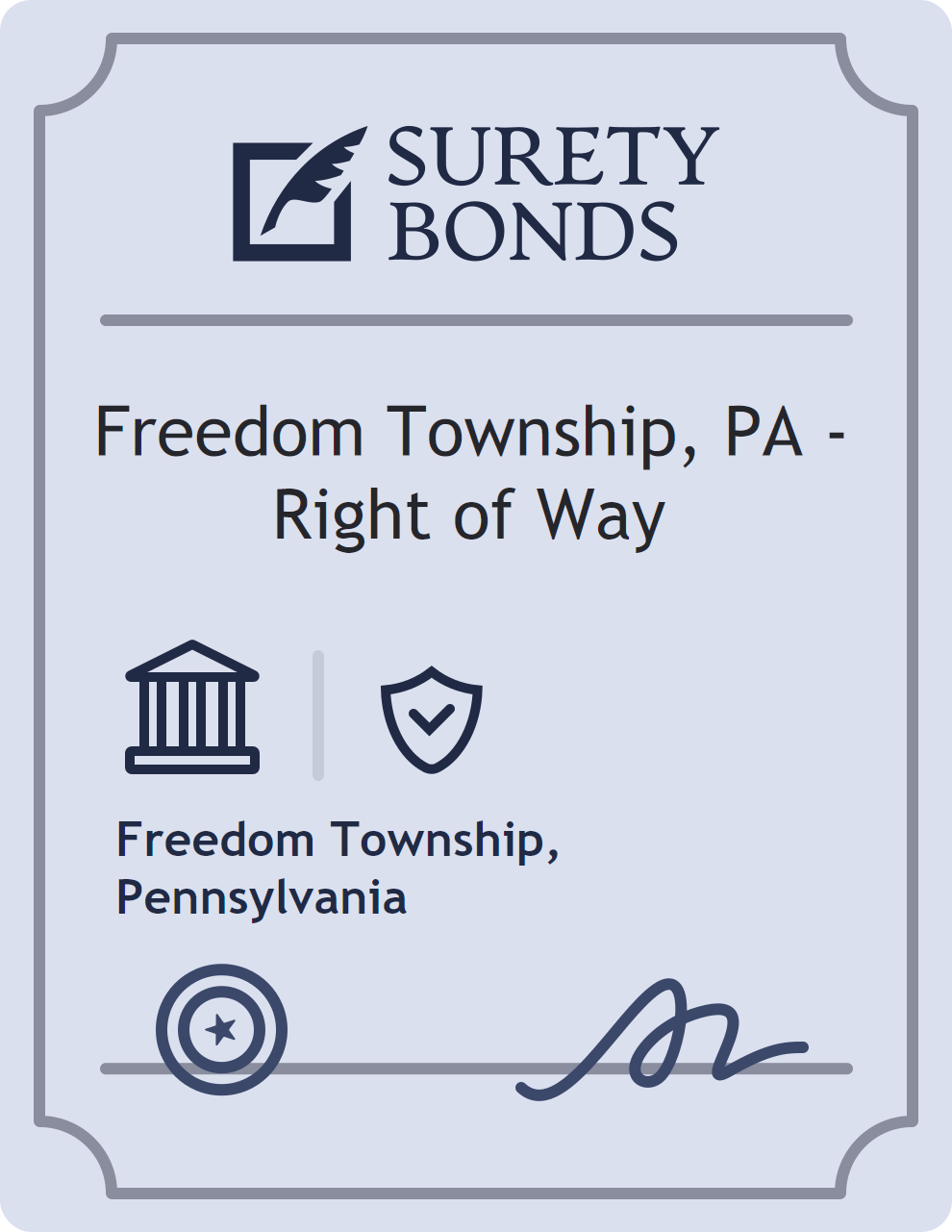 The Freedom Township, PA – Right of Way is classified as a Government/Public Official Bonds with a $10,000 obligation in Pennsylvania. Government/Public Official Bonds are surety bonds that ensure elected and appointed officials perform their duties faithfully and in accordance with the law. These bonds provide financial protection in cases of misconduct, negligence, or misuse of authority by public officials. The surety reviews financial strength, compliance history, and indemnity support before approving the obligation. Maintaining uninterrupted coverage for the entire 1 Year term is essential; lapses can trigger penalties, contract defaults, or license suspension in Pennsylvania. Underwriters typically request financial statements, references, and proof of licensing before quoting terms so they can evaluate repayment capacity. Throughout the bond term, the principal must maintain accurate books, respond to regulator inquiries, and remediate any complaints to prevent a claim. Many authorities in Pennsylvania also require renewal certificates 30 to 60 days in advance, and failure to provide proof can halt permitting or bid submissions. The $10,000 limit demonstrates to customers, partners, and oversight agencies that the bonded party maintains a reliable, surety-backed source of funds dedicated to ongoing compliance. The obligee for this bond is Freedom Township.