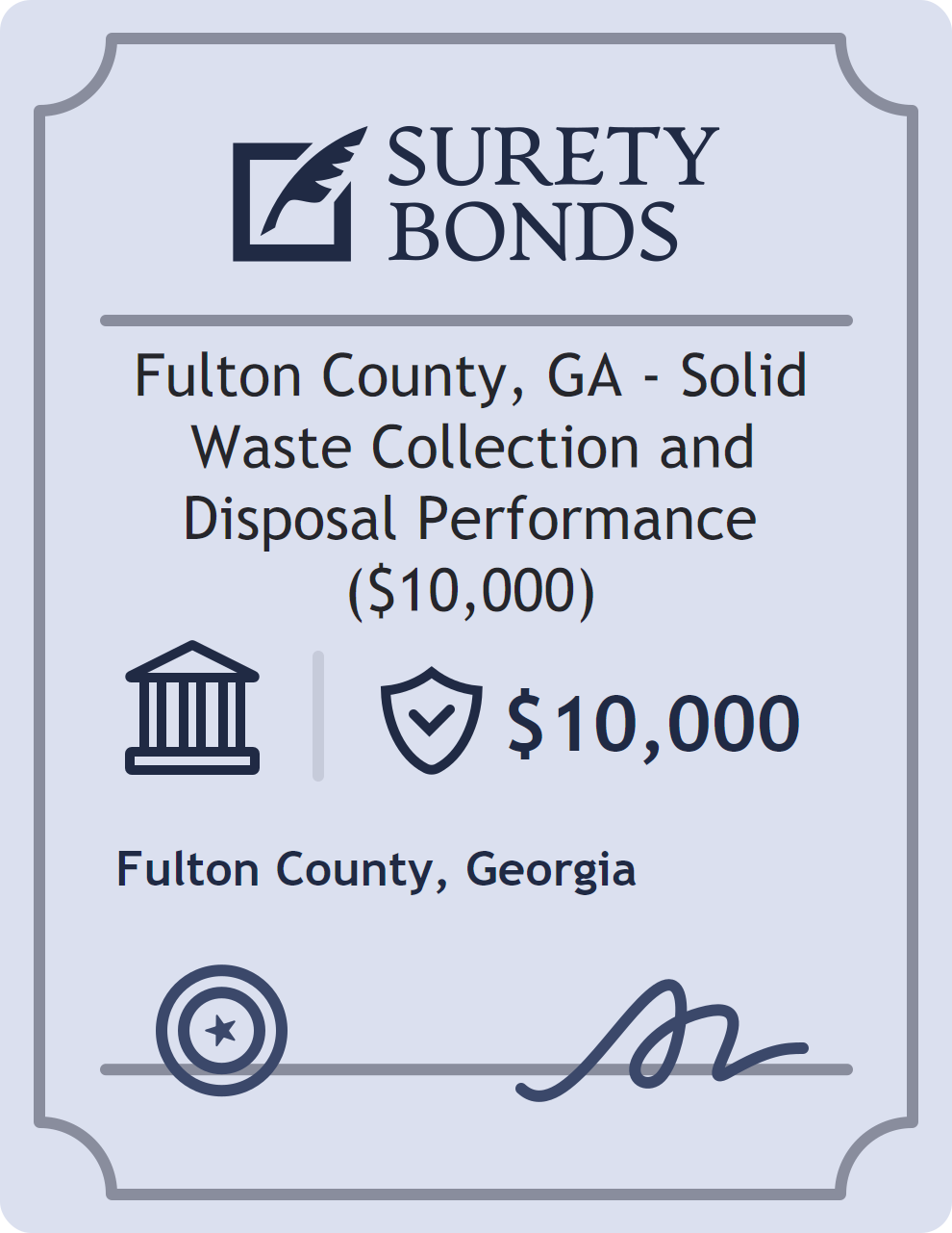 The Fulton County, GA – Solid Waste Collection and Disposal Performance ($10,000) is classified as a Government/Public Official Bonds with a $10,000 obligation in Georgia. Government/Public Official Bonds are surety bonds that ensure elected and appointed officials perform their duties faithfully and in accordance with the law. These bonds provide financial protection in cases of misconduct, negligence, or misuse of authority by public officials. The surety reviews financial strength, compliance history, and indemnity support before approving the obligation. Maintaining uninterrupted coverage for the entire 1 Year term is essential; lapses can trigger penalties, contract defaults, or license suspension in Georgia. Underwriters typically request financial statements, references, and proof of licensing before quoting terms so they can evaluate repayment capacity. Throughout the bond term, the principal must maintain accurate books, respond to regulator inquiries, and remediate any complaints to prevent a claim. Many authorities in Georgia also require renewal certificates 30 to 60 days in advance, and failure to provide proof can halt permitting or bid submissions. The $10,000 limit demonstrates to customers, partners, and oversight agencies that the bonded party maintains a reliable, surety-backed source of funds dedicated to ongoing compliance. The obligee for this bond is Fulton County.