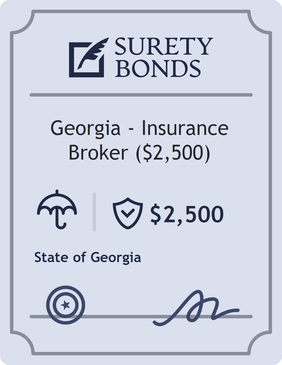 The Georgia – Insurance Broker ($2,500) is classified as a Insurance Bonds with a $2,500 obligation in Georgia. Insurance Bonds are surety bonds required for insurance professionals and agencies. They guarantee that agents comply with licensing laws, ethical standards, and financial regulations, providing protection for clients and regulatory bodies. The surety reviews financial strength, compliance history, and indemnity support before approving the obligation. Maintaining uninterrupted coverage for the entire 1 Year term is essential; lapses can trigger penalties, contract defaults, or license suspension in Georgia. Underwriters typically request financial statements, references, and proof of licensing before quoting terms so they can evaluate repayment capacity. Throughout the bond term, the principal must maintain accurate books, respond to regulator inquiries, and remediate any complaints to prevent a claim. Many authorities in Georgia also require renewal certificates 30 to 60 days in advance, and failure to provide proof can halt permitting or bid submissions. The $2,500 limit demonstrates to customers, partners, and oversight agencies that the bonded party maintains a reliable, surety-backed source of funds dedicated to ongoing compliance. The obligee for this bond is State of Georgia.