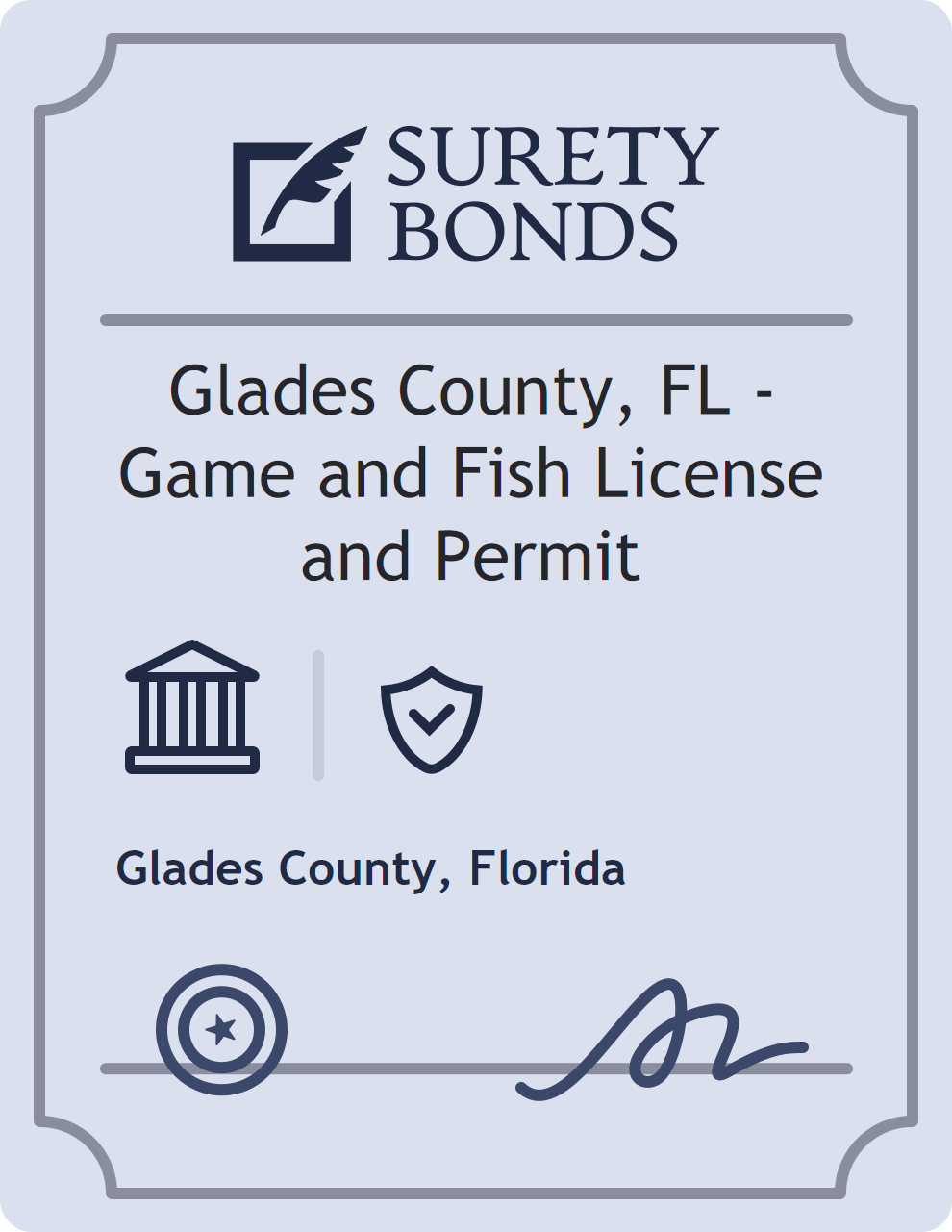 The Glades County, FL – Game and Fish License and Permit is classified as a Government/Public Official Bonds with a $10,000 obligation in Florida. Government/Public Official Bonds are surety bonds that ensure elected and appointed officials perform their duties faithfully and in accordance with the law. These bonds provide financial protection in cases of misconduct, negligence, or misuse of authority by public officials. The surety reviews financial strength, compliance history, and indemnity support before approving the obligation. Maintaining uninterrupted coverage for the entire 1 Year term is essential; lapses can trigger penalties, contract defaults, or license suspension in Florida. Underwriters typically request financial statements, references, and proof of licensing before quoting terms so they can evaluate repayment capacity. Throughout the bond term, the principal must maintain accurate books, respond to regulator inquiries, and remediate any complaints to prevent a claim. Many authorities in Florida also require renewal certificates 30 to 60 days in advance, and failure to provide proof can halt permitting or bid submissions. The $10,000 limit demonstrates to customers, partners, and oversight agencies that the bonded party maintains a reliable, surety-backed source of funds dedicated to ongoing compliance. The obligee for this bond is Glades County.