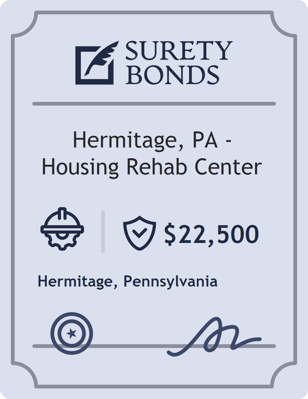 The Hermitage, PA – Housing Rehab Center is classified as a Contractor Bonds with a $22,500.00 obligation in Pennsylvania. Contractor Bonds are surety bonds required for individuals or businesses performing construction work. They guarantee that contractors will comply with building codes, licensing requirements, and contractual obligations. The bond provides financial protection to property owners and the public in cases of poor workmanship, regulatory violations, or unfinished work. The surety reviews financial strength, compliance history, and indemnity support before approving the obligation. Maintaining uninterrupted coverage for the entire 1 Year term is essential; lapses can trigger penalties, contract defaults, or license suspension in Pennsylvania. Underwriters typically request financial statements, references, and proof of licensing before quoting terms so they can evaluate repayment capacity. Throughout the bond term, the principal must maintain accurate books, respond to regulator inquiries, and remediate any complaints to prevent a claim. Many authorities in Pennsylvania also require renewal certificates 30 to 60 days in advance, and failure to provide proof can halt permitting or bid submissions. The $22,500.00 limit demonstrates to customers, partners, and oversight agencies that the bonded party maintains a reliable, surety-backed source of funds dedicated to ongoing compliance. The obligee for this bond is Hermitage.