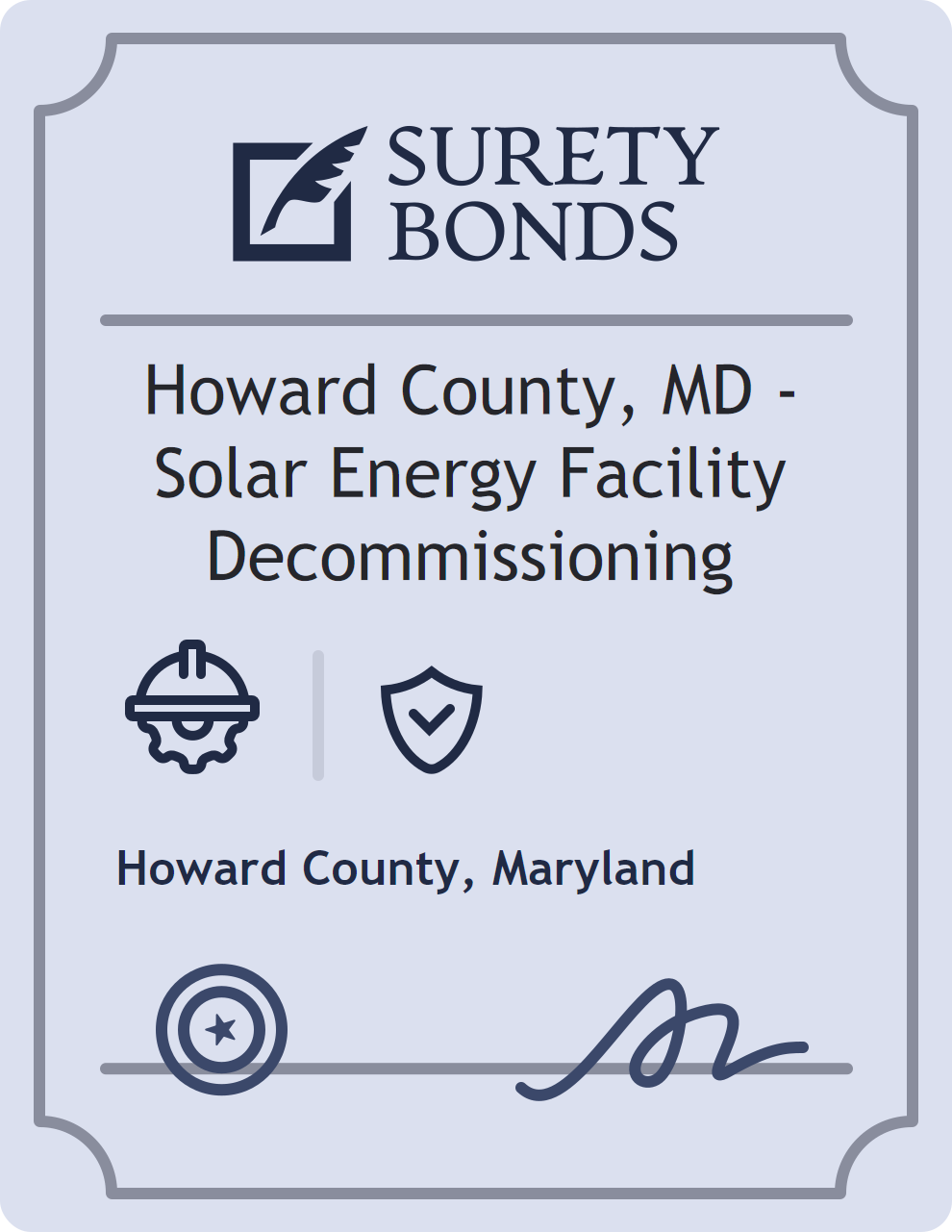 The Howard County, MD – Solar Energy Facility Decommissioning is classified as a Contractor Bonds with a $10,000 obligation in Maryland. Contractor Bonds are surety bonds required for individuals or businesses performing construction work. They guarantee that contractors will comply with building codes, licensing requirements, and contractual obligations. The bond provides financial protection to property owners and the public in cases of poor workmanship, regulatory violations, or unfinished work. The surety reviews financial strength, compliance history, and indemnity support before approving the obligation. Maintaining uninterrupted coverage for the entire 1 Year term is essential; lapses can trigger penalties, contract defaults, or license suspension in Maryland. Underwriters typically request financial statements, references, and proof of licensing before quoting terms so they can evaluate repayment capacity. Throughout the bond term, the principal must maintain accurate books, respond to regulator inquiries, and remediate any complaints to prevent a claim. Many authorities in Maryland also require renewal certificates 30 to 60 days in advance, and failure to provide proof can halt permitting or bid submissions. The $10,000 limit demonstrates to customers, partners, and oversight agencies that the bonded party maintains a reliable, surety-backed source of funds dedicated to ongoing compliance. The obligee for this bond is Howard County.