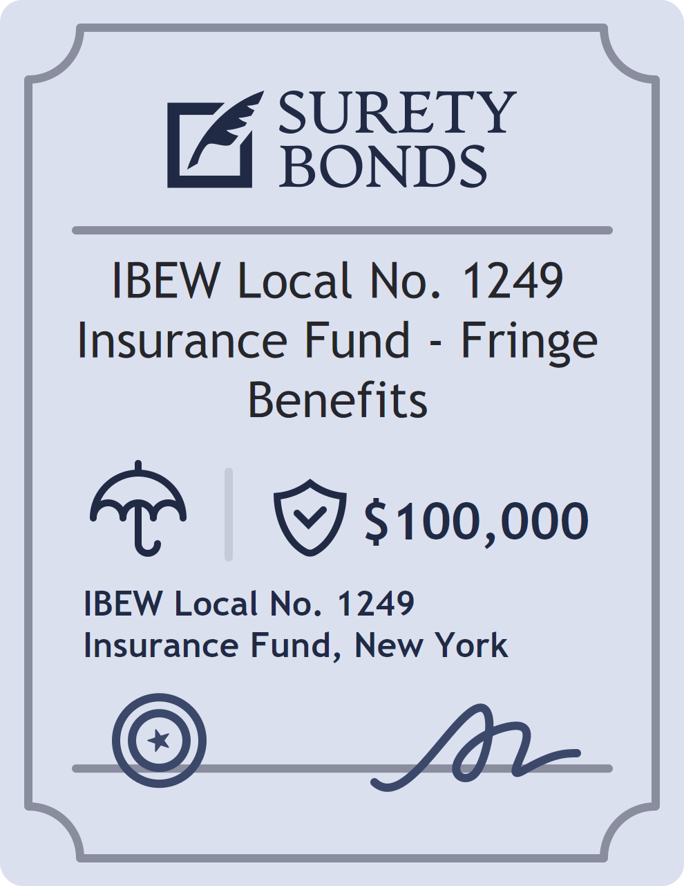 The IBEW Local No. 1249 Insurance Fund – Fringe Benefits is classified as a Insurance Bonds with a $100,000.00 obligation in New York. Insurance Bonds are surety bonds required for insurance professionals and agencies. They guarantee that agents comply with licensing laws, ethical standards, and financial regulations, providing protection for clients and regulatory bodies. The surety reviews financial strength, compliance history, and indemnity support before approving the obligation. Maintaining uninterrupted coverage for the entire 1 Year term is essential; lapses can trigger penalties, contract defaults, or license suspension in New York. Underwriters typically request financial statements, references, and proof of licensing before quoting terms so they can evaluate repayment capacity. Throughout the bond term, the principal must maintain accurate books, respond to regulator inquiries, and remediate any complaints to prevent a claim. Many authorities in New York also require renewal certificates 30 to 60 days in advance, and failure to provide proof can halt permitting or bid submissions. The $100,000.00 limit demonstrates to customers, partners, and oversight agencies that the bonded party maintains a reliable, surety-backed source of funds dedicated to ongoing compliance. The obligee for this bond is IBEW Local No. 1249 Insurance Fund.