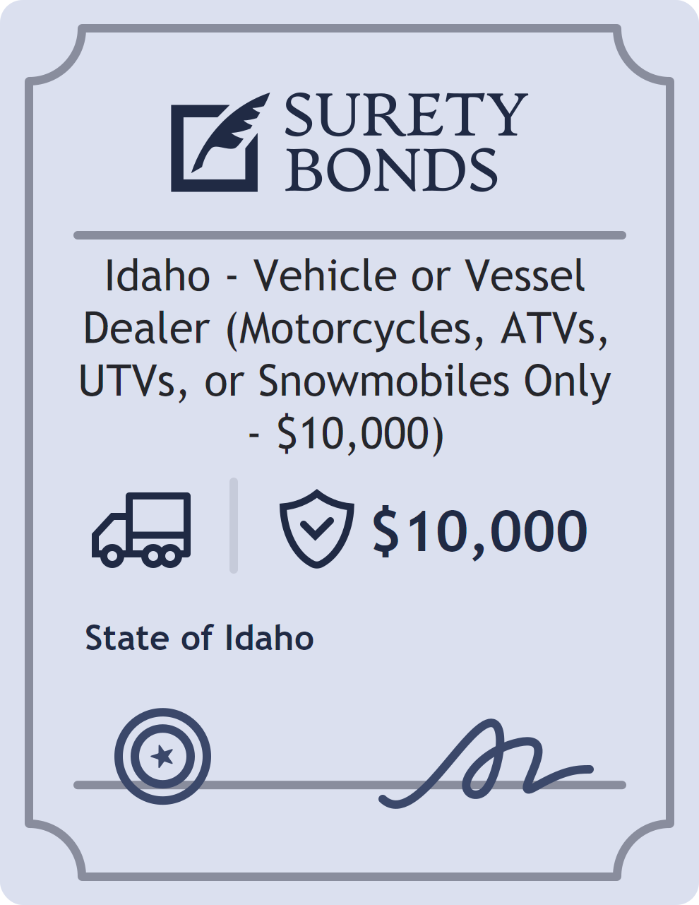 Idaho – Vehicle or Vessel Dealer (Motorcycles, ATVs, UTVs, or Snowmobiles Only – $10,000) Bond