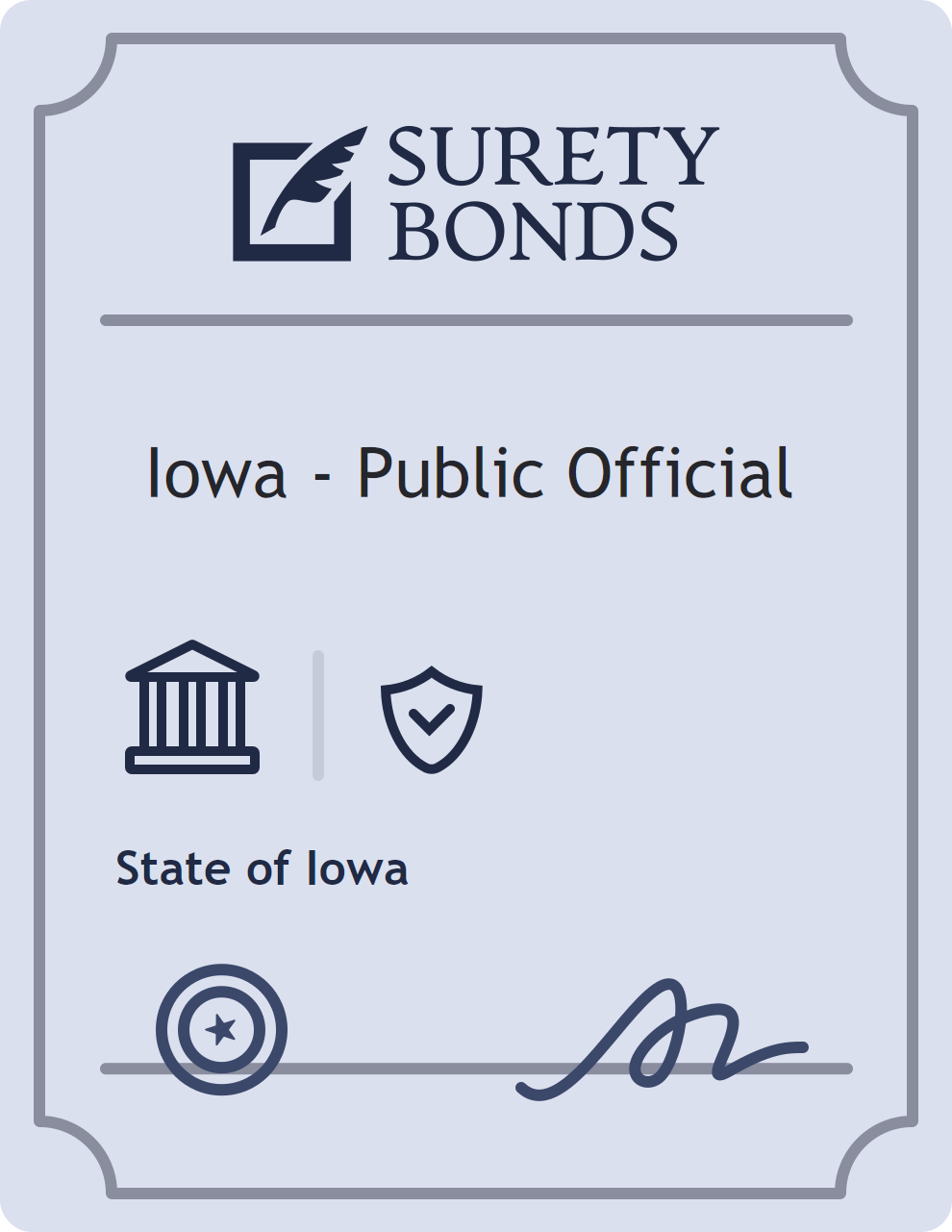 The Iowa – Public Official is classified as a Government/Public Official Bonds with a $10,000 obligation in Iowa. Government/Public Official Bonds are surety bonds that ensure elected and appointed officials perform their duties faithfully and in accordance with the law. These bonds provide financial protection in cases of misconduct, negligence, or misuse of authority by public officials. The surety reviews financial strength, compliance history, and indemnity support before approving the obligation. Maintaining uninterrupted coverage for the entire 1 Year term is essential; lapses can trigger penalties, contract defaults, or license suspension in Iowa. Underwriters typically request financial statements, references, and proof of licensing before quoting terms so they can evaluate repayment capacity. Throughout the bond term, the principal must maintain accurate books, respond to regulator inquiries, and remediate any complaints to prevent a claim. Many authorities in Iowa also require renewal certificates 30 to 60 days in advance, and failure to provide proof can halt permitting or bid submissions. The $10,000 limit demonstrates to customers, partners, and oversight agencies that the bonded party maintains a reliable, surety-backed source of funds dedicated to ongoing compliance. The obligee for this bond is State of Iowa.