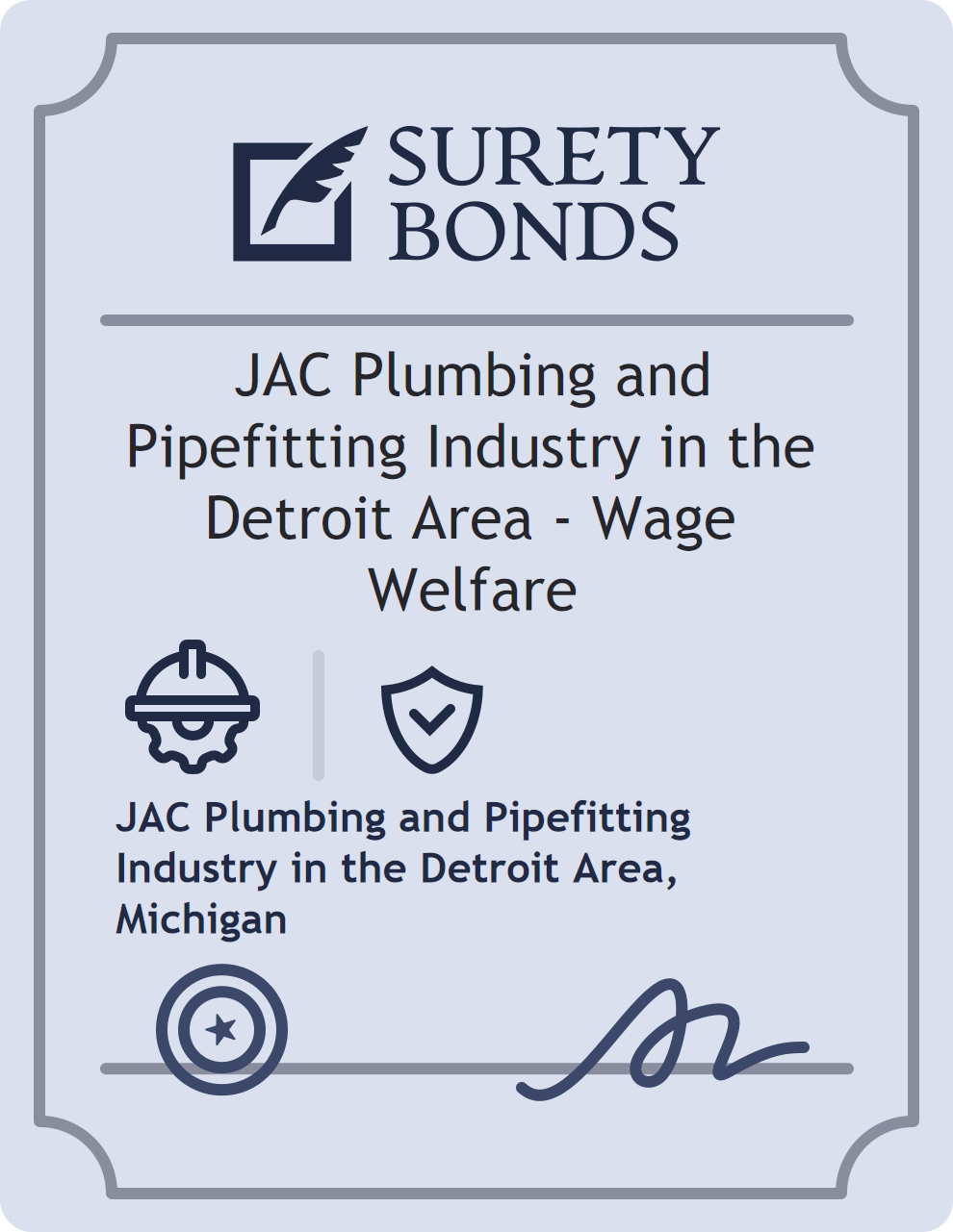 The JAC Plumbing and Pipefitting Industry in the Detroit Area – Wage Welfare is classified as a Contractor Bonds with a $10,000 obligation in Michigan. Contractor Bonds are surety bonds required for individuals or businesses performing construction work. They guarantee that contractors will comply with building codes, licensing requirements, and contractual obligations. The bond provides financial protection to property owners and the public in cases of poor workmanship, regulatory violations, or unfinished work. The surety reviews financial strength, compliance history, and indemnity support before approving the obligation. Maintaining uninterrupted coverage for the entire 1 Year term is essential; lapses can trigger penalties, contract defaults, or license suspension in Michigan. Underwriters typically request financial statements, references, and proof of licensing before quoting terms so they can evaluate repayment capacity. Throughout the bond term, the principal must maintain accurate books, respond to regulator inquiries, and remediate any complaints to prevent a claim. Many authorities in Michigan also require renewal certificates 30 to 60 days in advance, and failure to provide proof can halt permitting or bid submissions. The $10,000 limit demonstrates to customers, partners, and oversight agencies that the bonded party maintains a reliable, surety-backed source of funds dedicated to ongoing compliance. The obligee for this bond is JAC Plumbing and Pipefitting Industry in the Detroit Area.