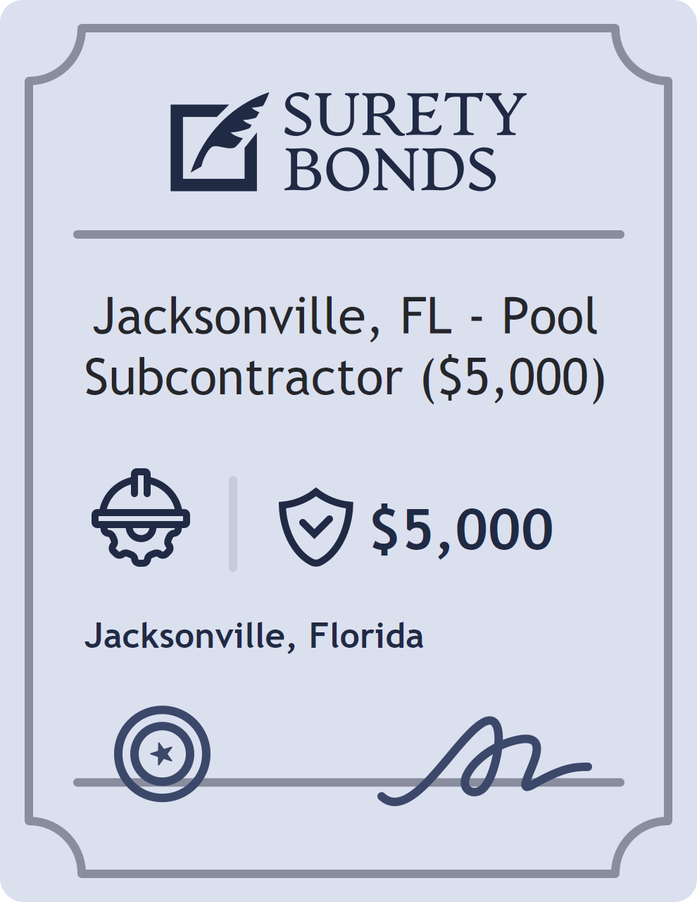 The Jacksonville, FL – Pool Subcontractor ($5,000) is classified as a Contractor Bonds with a $5,000 obligation in Florida. Contractor Bonds are surety bonds required for individuals or businesses performing construction work. They guarantee that contractors will comply with building codes, licensing requirements, and contractual obligations. The bond provides financial protection to property owners and the public in cases of poor workmanship, regulatory violations, or unfinished work. The surety reviews financial strength, compliance history, and indemnity support before approving the obligation. Maintaining uninterrupted coverage for the entire 1 Year term is essential; lapses can trigger penalties, contract defaults, or license suspension in Florida. Underwriters typically request financial statements, references, and proof of licensing before quoting terms so they can evaluate repayment capacity. Throughout the bond term, the principal must maintain accurate books, respond to regulator inquiries, and remediate any complaints to prevent a claim. Many authorities in Florida also require renewal certificates 30 to 60 days in advance, and failure to provide proof can halt permitting or bid submissions. The $5,000 limit demonstrates to customers, partners, and oversight agencies that the bonded party maintains a reliable, surety-backed source of funds dedicated to ongoing compliance. The obligee for this bond is Jacksonville.