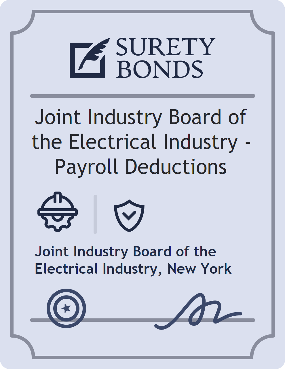 The Joint Industry Board of the Electrical Industry – Payroll Deductions is classified as a Contractor Bonds with a $10,000 obligation in New York. Contractor Bonds are surety bonds required for individuals or businesses performing construction work. They guarantee that contractors will comply with building codes, licensing requirements, and contractual obligations. The bond provides financial protection to property owners and the public in cases of poor workmanship, regulatory violations, or unfinished work. The surety reviews financial strength, compliance history, and indemnity support before approving the obligation. Maintaining uninterrupted coverage for the entire 1 Year term is essential; lapses can trigger penalties, contract defaults, or license suspension in New York. Underwriters typically request financial statements, references, and proof of licensing before quoting terms so they can evaluate repayment capacity. Throughout the bond term, the principal must maintain accurate books, respond to regulator inquiries, and remediate any complaints to prevent a claim. Many authorities in New York also require renewal certificates 30 to 60 days in advance, and failure to provide proof can halt permitting or bid submissions. The $10,000 limit demonstrates to customers, partners, and oversight agencies that the bonded party maintains a reliable, surety-backed source of funds dedicated to ongoing compliance. The obligee for this bond is Joint Industry Board of the Electrical Industry.