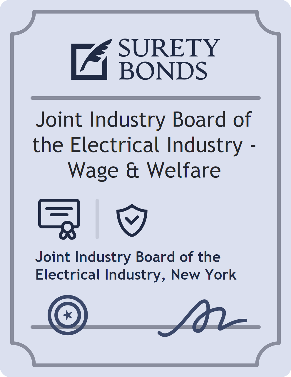 The Joint Industry Board of the Electrical Industry – Wage & Welfare is classified as a Professional License Bonds with a $10,000 obligation in New York. Professional License Bonds are surety bonds required for licensed professionals across various industries. They guarantee compliance with licensing laws and ethical standards, protecting clients and regulatory bodies from harm. The surety reviews financial strength, compliance history, and indemnity support before approving the obligation. Maintaining uninterrupted coverage for the entire 1 Year term is essential; lapses can trigger penalties, contract defaults, or license suspension in New York. Underwriters typically request financial statements, references, and proof of licensing before quoting terms so they can evaluate repayment capacity. Throughout the bond term, the principal must maintain accurate books, respond to regulator inquiries, and remediate any complaints to prevent a claim. Many authorities in New York also require renewal certificates 30 to 60 days in advance, and failure to provide proof can halt permitting or bid submissions. The $10,000 limit demonstrates to customers, partners, and oversight agencies that the bonded party maintains a reliable, surety-backed source of funds dedicated to ongoing compliance. The obligee for this bond is Joint Industry Board of the Electrical Industry.