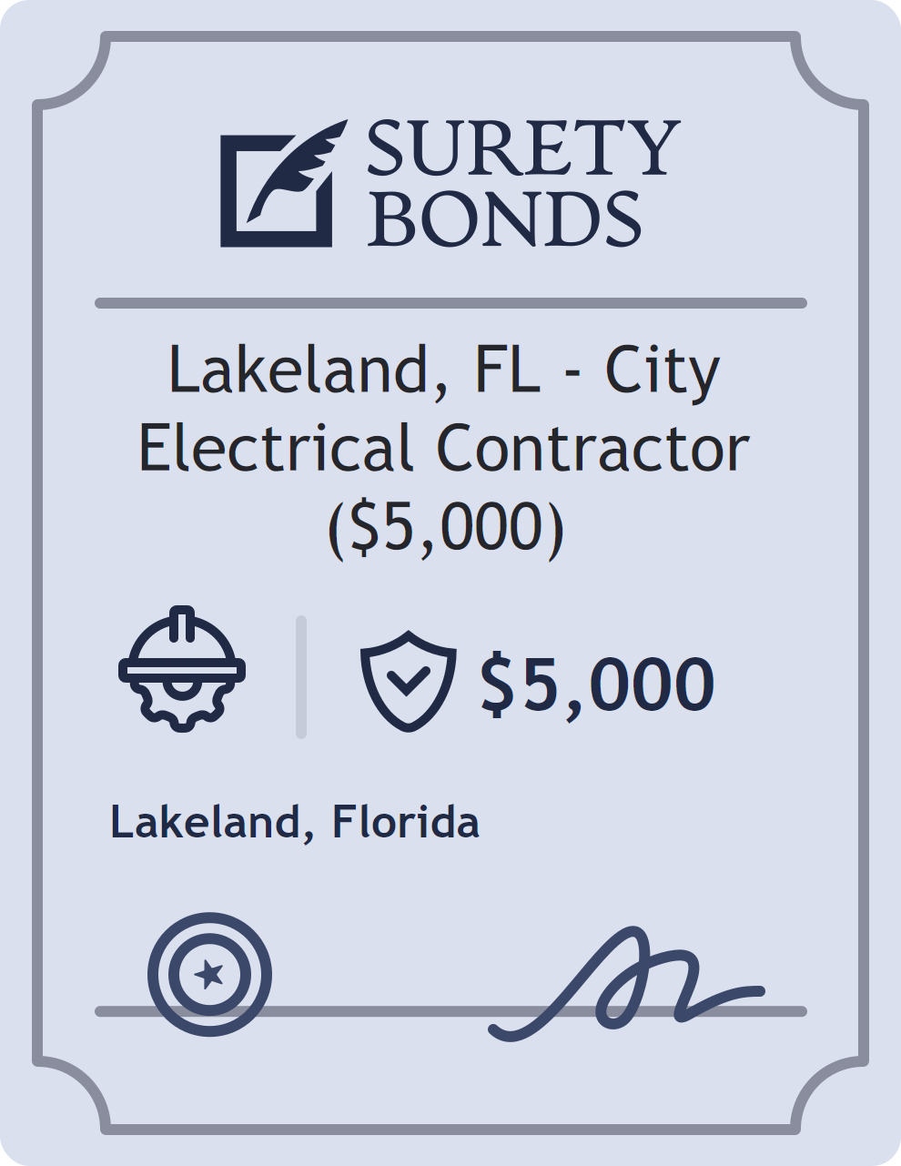 The Lakeland, FL – City Electrical Contractor ($5,000) is classified as a Contractor Bonds with a $5,000 obligation in Florida. Contractor Bonds are surety bonds required for individuals or businesses performing construction work. They guarantee that contractors will comply with building codes, licensing requirements, and contractual obligations. The bond provides financial protection to property owners and the public in cases of poor workmanship, regulatory violations, or unfinished work. The surety reviews financial strength, compliance history, and indemnity support before approving the obligation. Maintaining uninterrupted coverage for the entire 1 Year term is essential; lapses can trigger penalties, contract defaults, or license suspension in Florida. Underwriters typically request financial statements, references, and proof of licensing before quoting terms so they can evaluate repayment capacity. Throughout the bond term, the principal must maintain accurate books, respond to regulator inquiries, and remediate any complaints to prevent a claim. Many authorities in Florida also require renewal certificates 30 to 60 days in advance, and failure to provide proof can halt permitting or bid submissions. The $5,000 limit demonstrates to customers, partners, and oversight agencies that the bonded party maintains a reliable, surety-backed source of funds dedicated to ongoing compliance. The obligee for this bond is Lakeland.