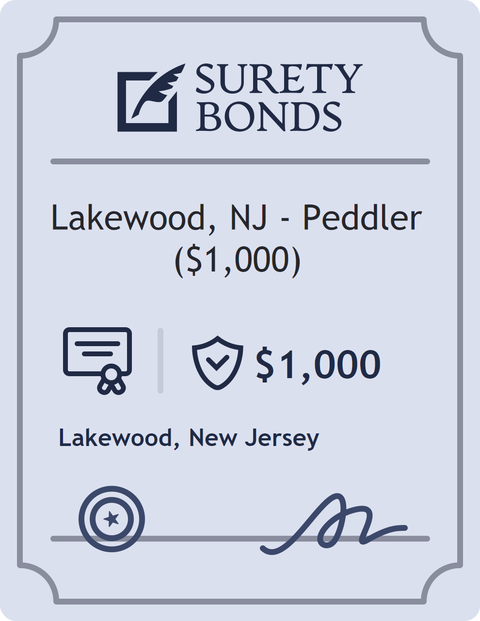 The Lakewood, NJ – Peddler ($1,000) is classified as a Professional License Bonds with a $1,000 obligation in New Jersey. Professional License Bonds are surety bonds required for licensed professionals across various industries. They guarantee compliance with licensing laws and ethical standards, protecting clients and regulatory bodies from harm. The surety reviews financial strength, compliance history, and indemnity support before approving the obligation. Maintaining uninterrupted coverage for the entire 1 Year term is essential; lapses can trigger penalties, contract defaults, or license suspension in New Jersey. Underwriters typically request financial statements, references, and proof of licensing before quoting terms so they can evaluate repayment capacity. Throughout the bond term, the principal must maintain accurate books, respond to regulator inquiries, and remediate any complaints to prevent a claim. Many authorities in New Jersey also require renewal certificates 30 to 60 days in advance, and failure to provide proof can halt permitting or bid submissions. The $1,000 limit demonstrates to customers, partners, and oversight agencies that the bonded party maintains a reliable, surety-backed source of funds dedicated to ongoing compliance. The obligee for this bond is Lakewood.
