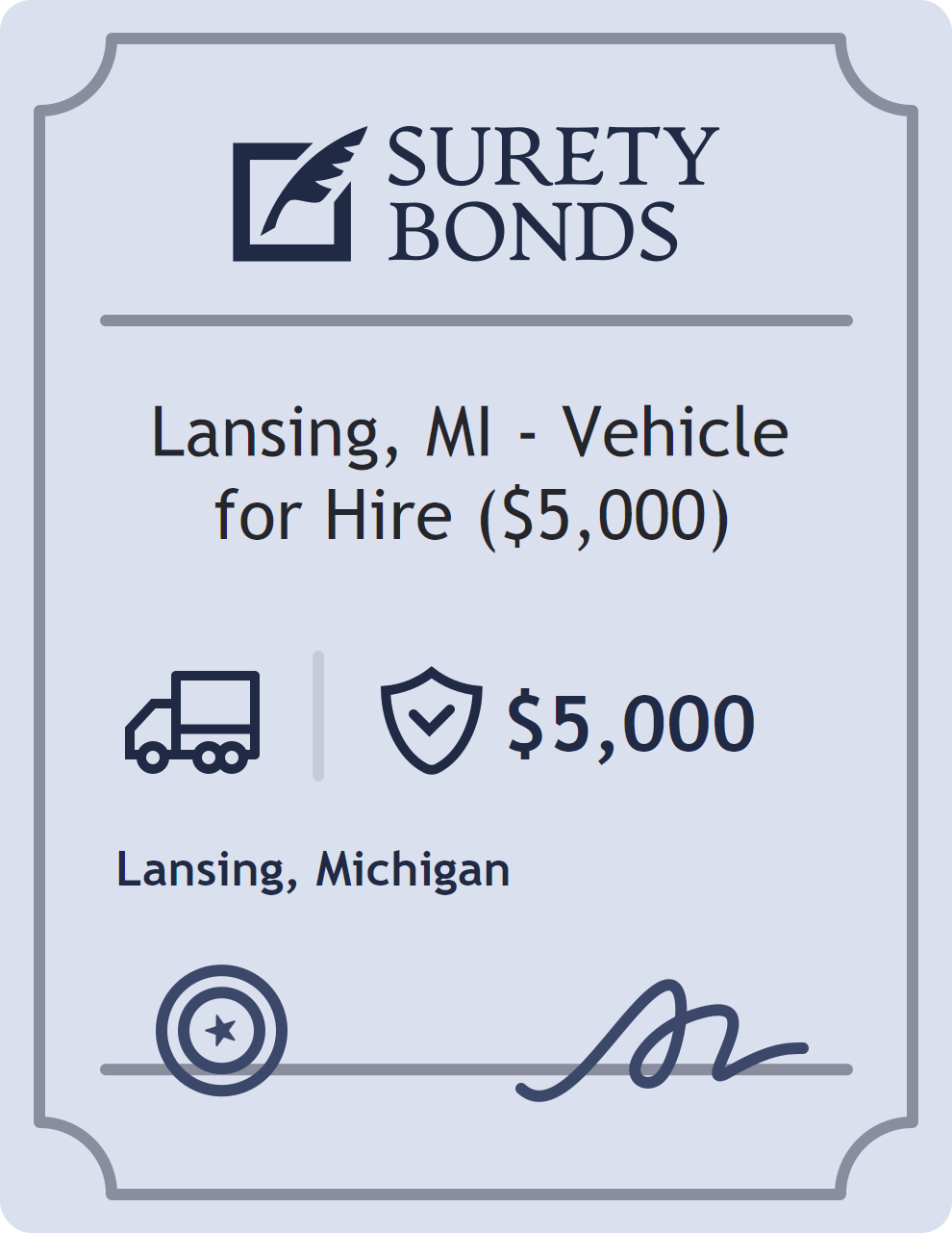The Lansing, MI – Vehicle for Hire ($5,000) is a $5,000 surety bond required in Michigan. It provides a financial guarantee that the bonded party will satisfy all statutory and contractual obligations related to this bond type. The surety reviews financial strength, compliance history, and indemnity support before approving the obligation. Maintaining uninterrupted coverage for the entire 1 Year term is essential; lapses can trigger penalties, contract defaults, or license suspension in Michigan. Underwriters typically request financial statements, references, and proof of licensing before quoting terms so they can evaluate repayment capacity. Throughout the bond term, the principal must maintain accurate books, respond to regulator inquiries, and remediate any complaints to prevent a claim. Many authorities in Michigan also require renewal certificates 30 to 60 days in advance, and failure to provide proof can halt permitting or bid submissions. The $5,000 limit demonstrates to customers, partners, and oversight agencies that the bonded party maintains a reliable, surety-backed source of funds dedicated to ongoing compliance. The obligee for this bond is Lansing.