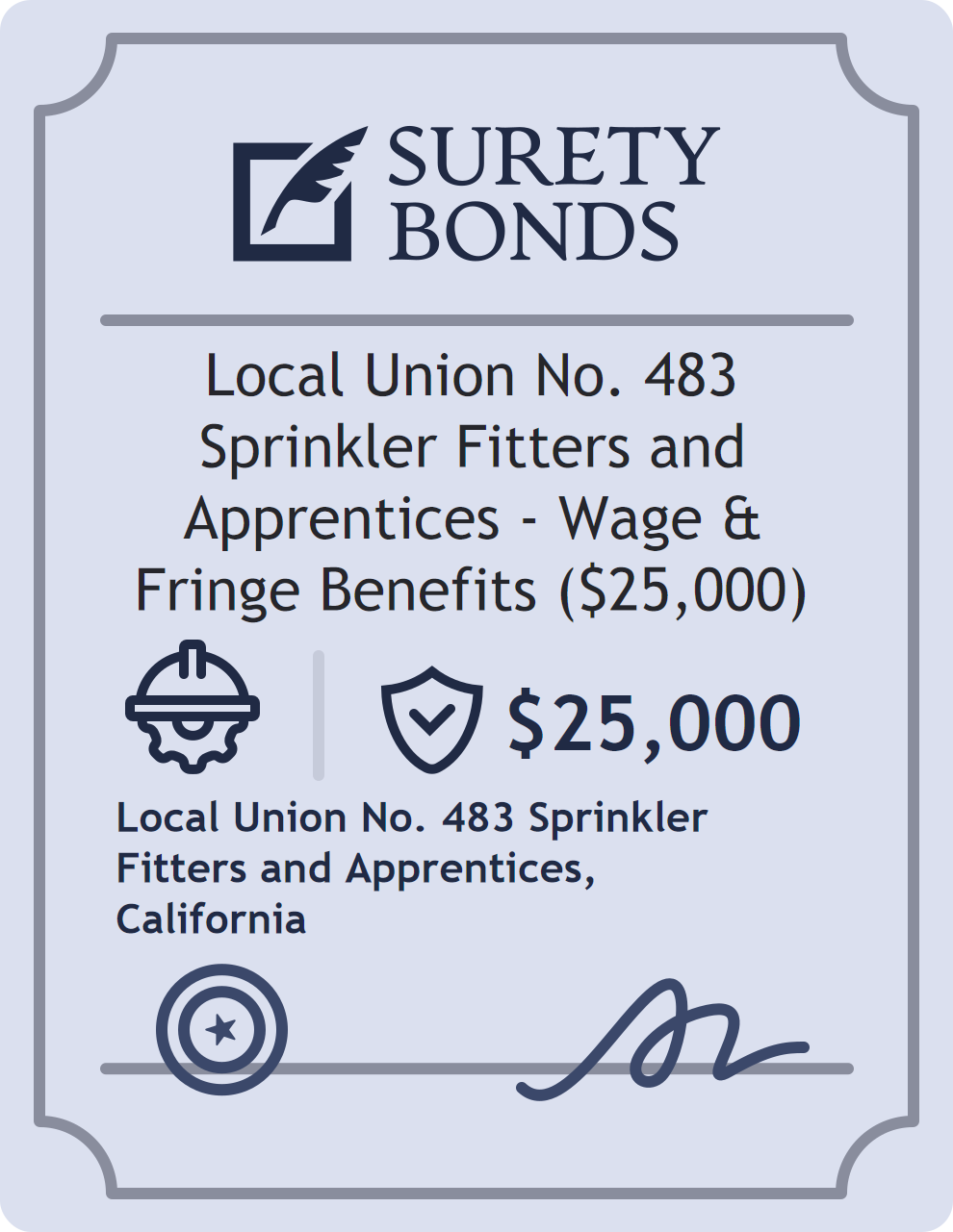 The Local Union No. 483 Sprinkler Fitters and Apprentices – Wage & Fringe Benefits ($25,000) is classified as a Contractor Bonds with a $25,000 obligation in California. Contractor Bonds are surety bonds required for individuals or businesses performing construction work. They guarantee that contractors will comply with building codes, licensing requirements, and contractual obligations. The bond provides financial protection to property owners and the public in cases of poor workmanship, regulatory violations, or unfinished work. The surety reviews financial strength, compliance history, and indemnity support before approving the obligation. Maintaining uninterrupted coverage for the entire 1 Year term is essential; lapses can trigger penalties, contract defaults, or license suspension in California. Underwriters typically request financial statements, references, and proof of licensing before quoting terms so they can evaluate repayment capacity. Throughout the bond term, the principal must maintain accurate books, respond to regulator inquiries, and remediate any complaints to prevent a claim. Many authorities in California also require renewal certificates 30 to 60 days in advance, and failure to provide proof can halt permitting or bid submissions. The $25,000 limit demonstrates to customers, partners, and oversight agencies that the bonded party maintains a reliable, surety-backed source of funds dedicated to ongoing compliance. The obligee for this bond is Local Union No. 483 Sprinkler Fitters and Apprentices.