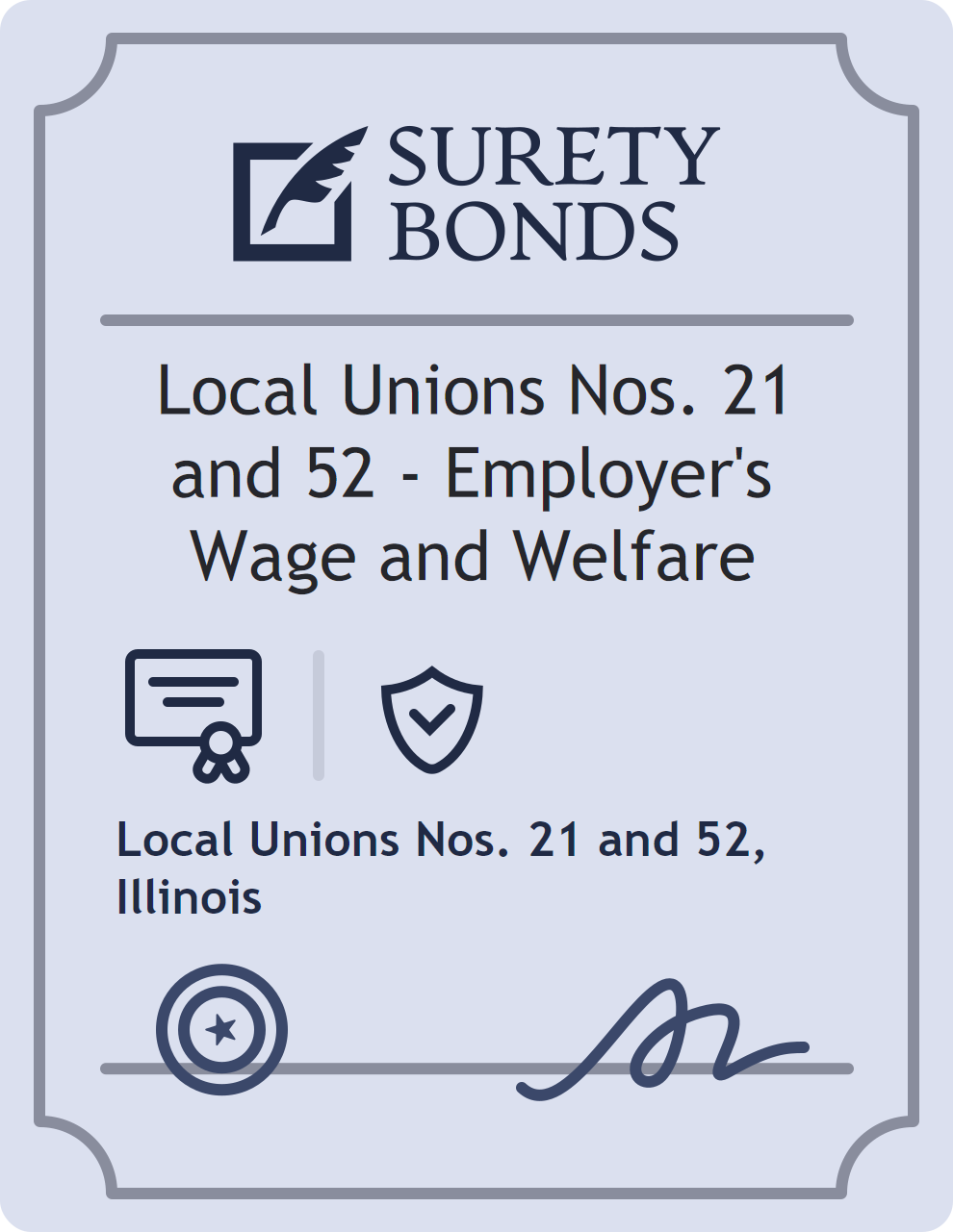 The Local Unions Nos. 21 and 52 – Employer’s Wage and Welfare is classified as a Professional License Bonds with a $10,000 obligation in Illinois. Professional License Bonds are surety bonds required for licensed professionals across various industries. They guarantee compliance with licensing laws and ethical standards, protecting clients and regulatory bodies from harm. The surety reviews financial strength, compliance history, and indemnity support before approving the obligation. Maintaining uninterrupted coverage for the entire 1 Year term is essential; lapses can trigger penalties, contract defaults, or license suspension in Illinois. Underwriters typically request financial statements, references, and proof of licensing before quoting terms so they can evaluate repayment capacity. Throughout the bond term, the principal must maintain accurate books, respond to regulator inquiries, and remediate any complaints to prevent a claim. Many authorities in Illinois also require renewal certificates 30 to 60 days in advance, and failure to provide proof can halt permitting or bid submissions. The $10,000 limit demonstrates to customers, partners, and oversight agencies that the bonded party maintains a reliable, surety-backed source of funds dedicated to ongoing compliance. The obligee for this bond is Local Unions Nos. 21 and 52.