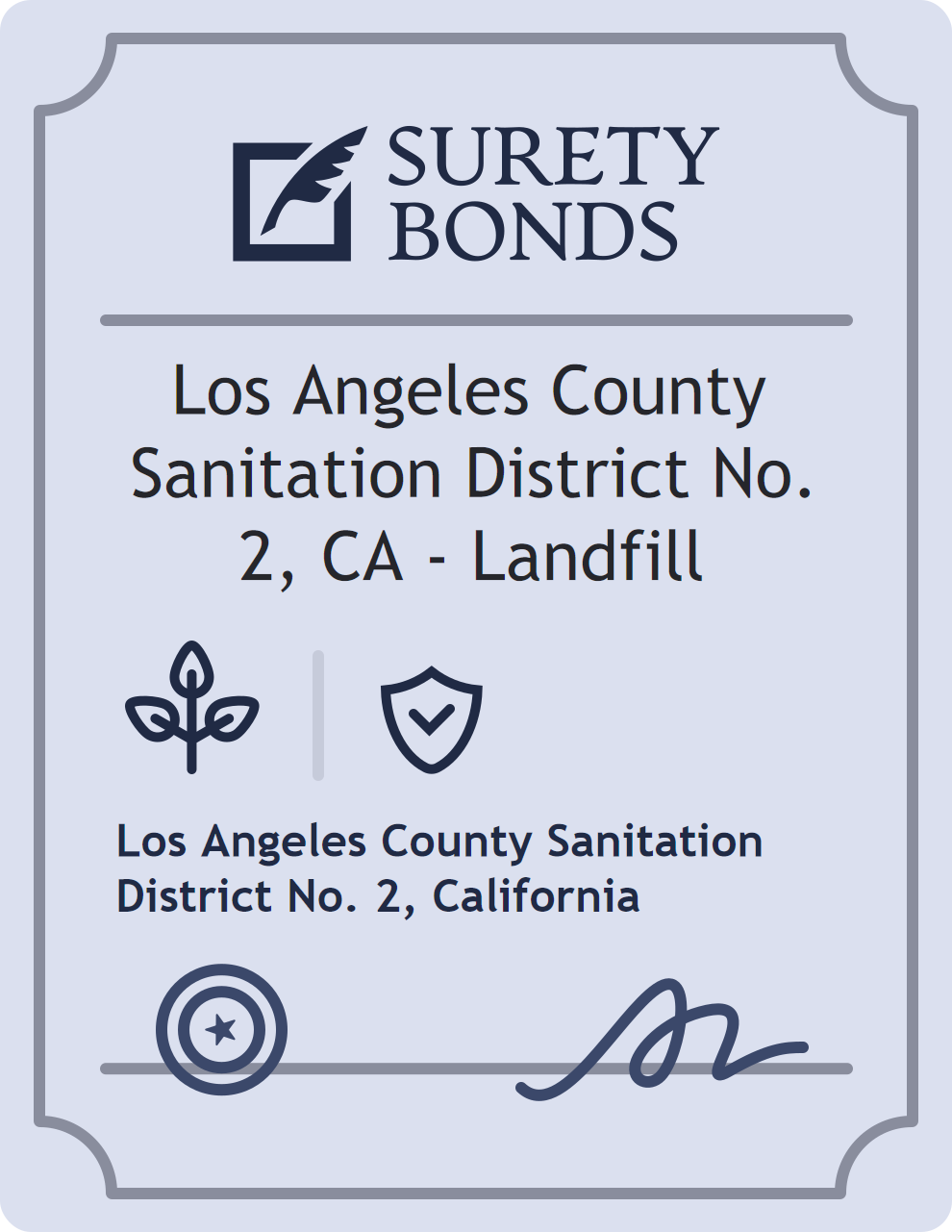 The Los Angeles County Sanitation District No. 2, CA – Landfill is classified as a Environmental Bonds with a $10,000 obligation in California. Environmental Bonds are surety bonds required for businesses and contractors engaged in activities that impact the environment, such as waste management, mining, or energy production. These bonds guarantee compliance with environmental regulations and ensure that funds are available for cleanup or remediation if necessary. The surety reviews financial strength, compliance history, and indemnity support before approving the obligation. Maintaining uninterrupted coverage for the entire 1 Year term is essential; lapses can trigger penalties, contract defaults, or license suspension in California. Underwriters typically request financial statements, references, and proof of licensing before quoting terms so they can evaluate repayment capacity. Throughout the bond term, the principal must maintain accurate books, respond to regulator inquiries, and remediate any complaints to prevent a claim. Many authorities in California also require renewal certificates 30 to 60 days in advance, and failure to provide proof can halt permitting or bid submissions. The $10,000 limit demonstrates to customers, partners, and oversight agencies that the bonded party maintains a reliable, surety-backed source of funds dedicated to ongoing compliance. The obligee for this bond is Los Angeles County Sanitation District No. 2.